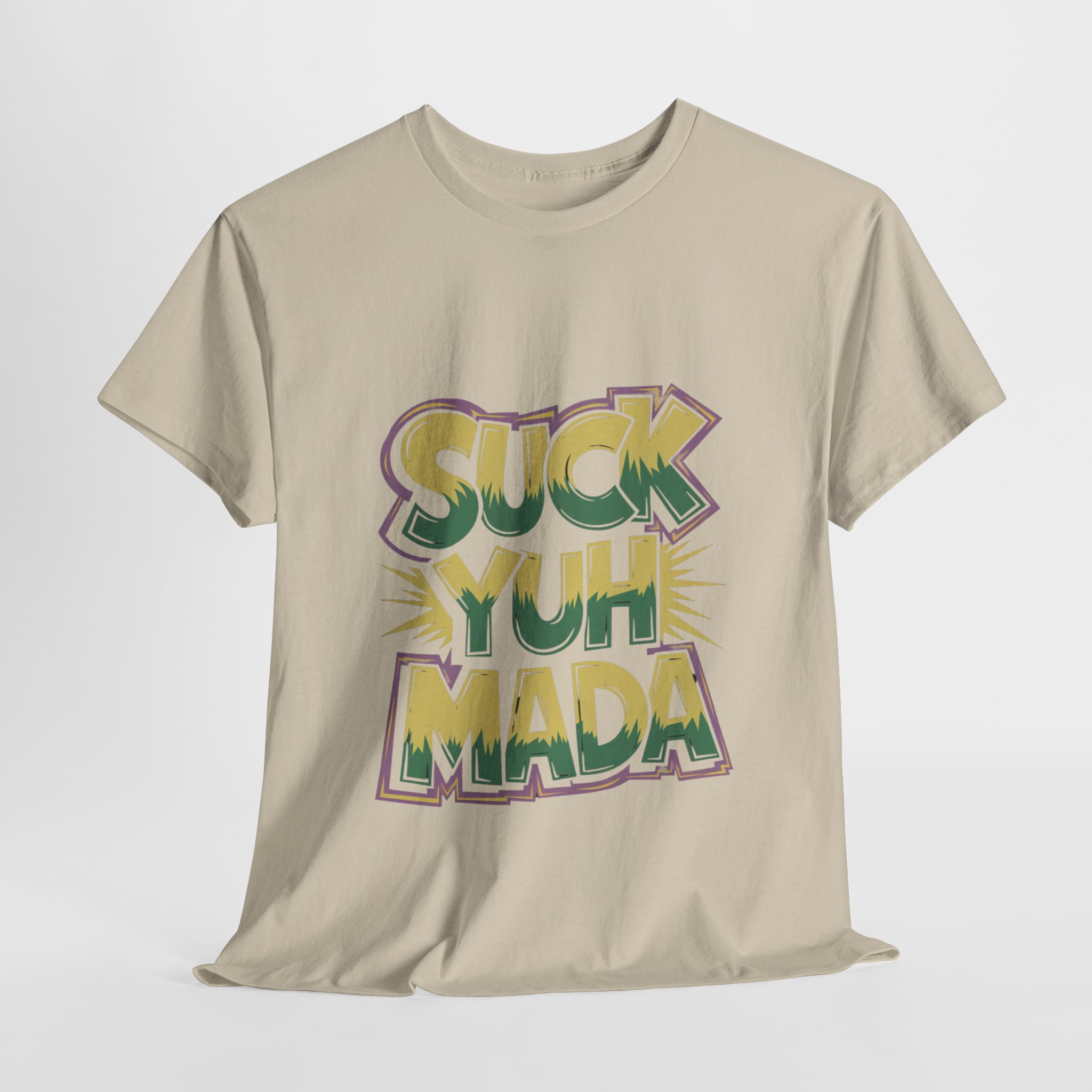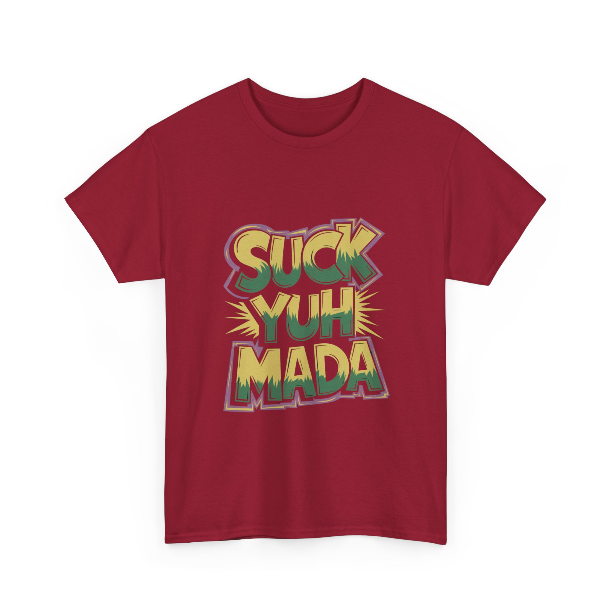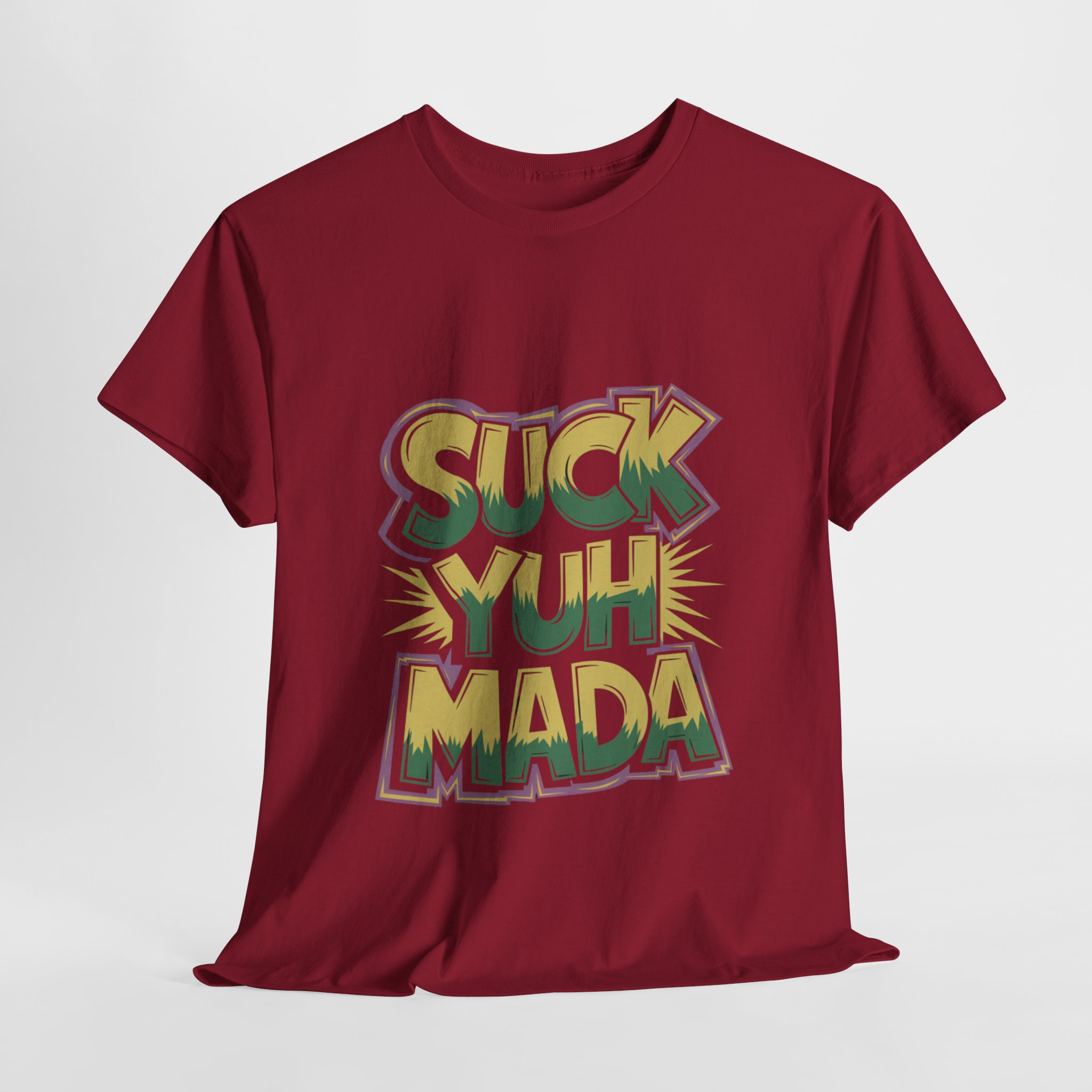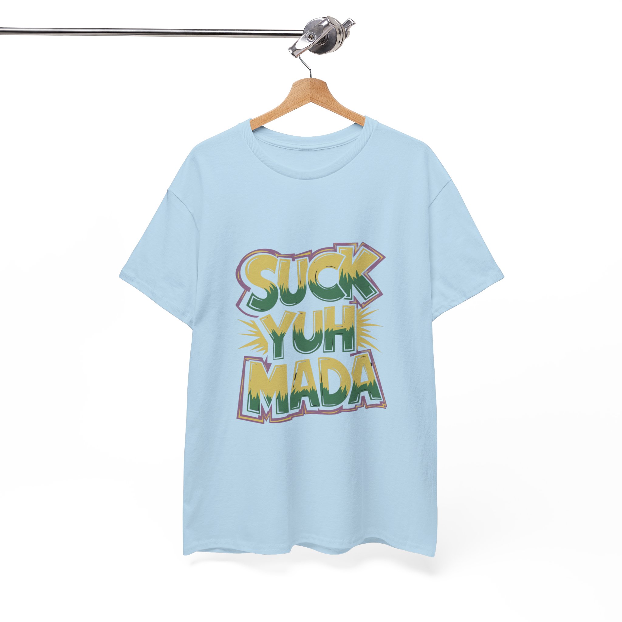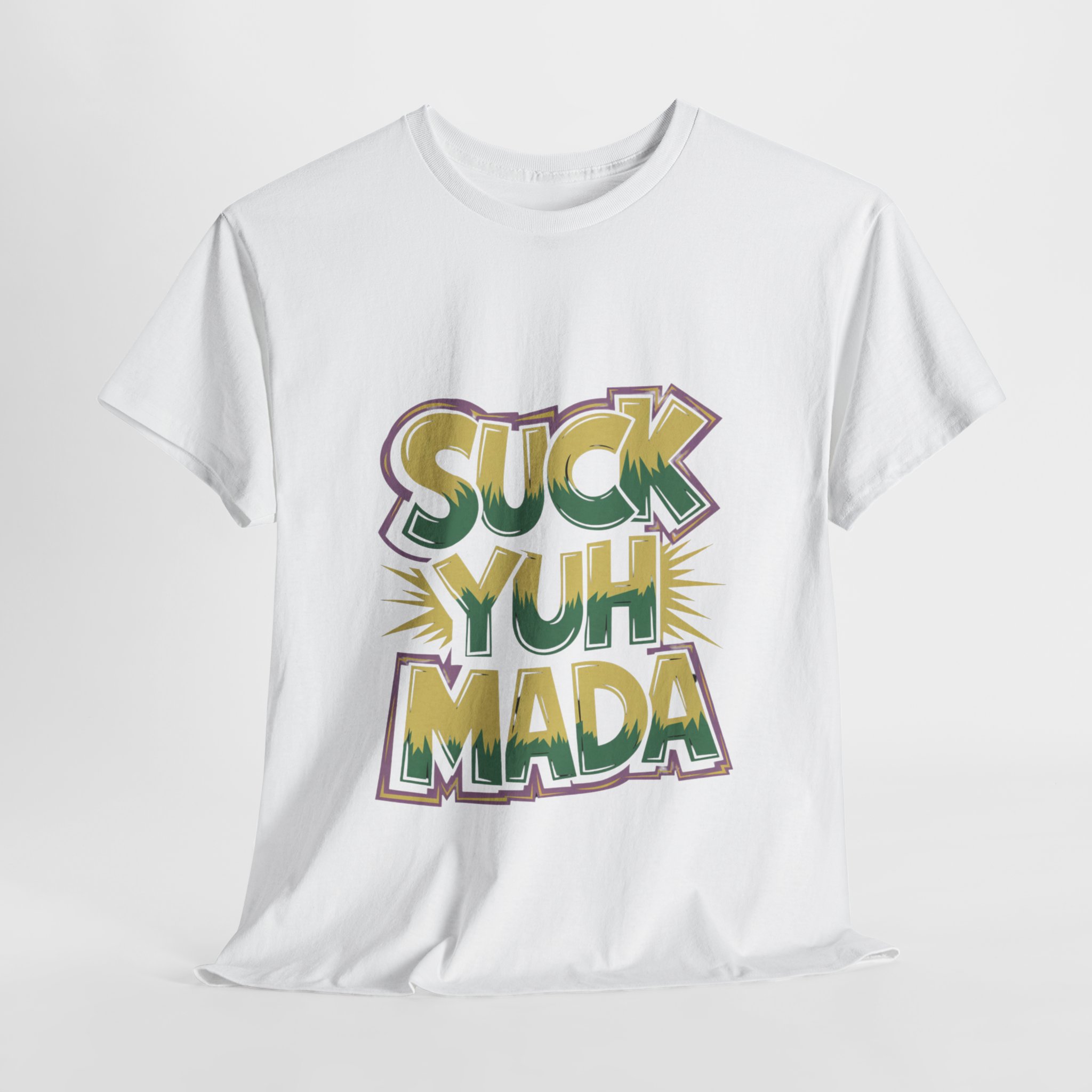 Bold and rebellious, the Suck Yuh Mada T-shirt features graffiti-inspired text in yellow, green, and purple, exuding an energetic vibe. Perfect for those who want to make a statement, this tee is ideal for casual wear and street style enthusiasts. Relevant for occasions where bold fashion choices are celebrated.