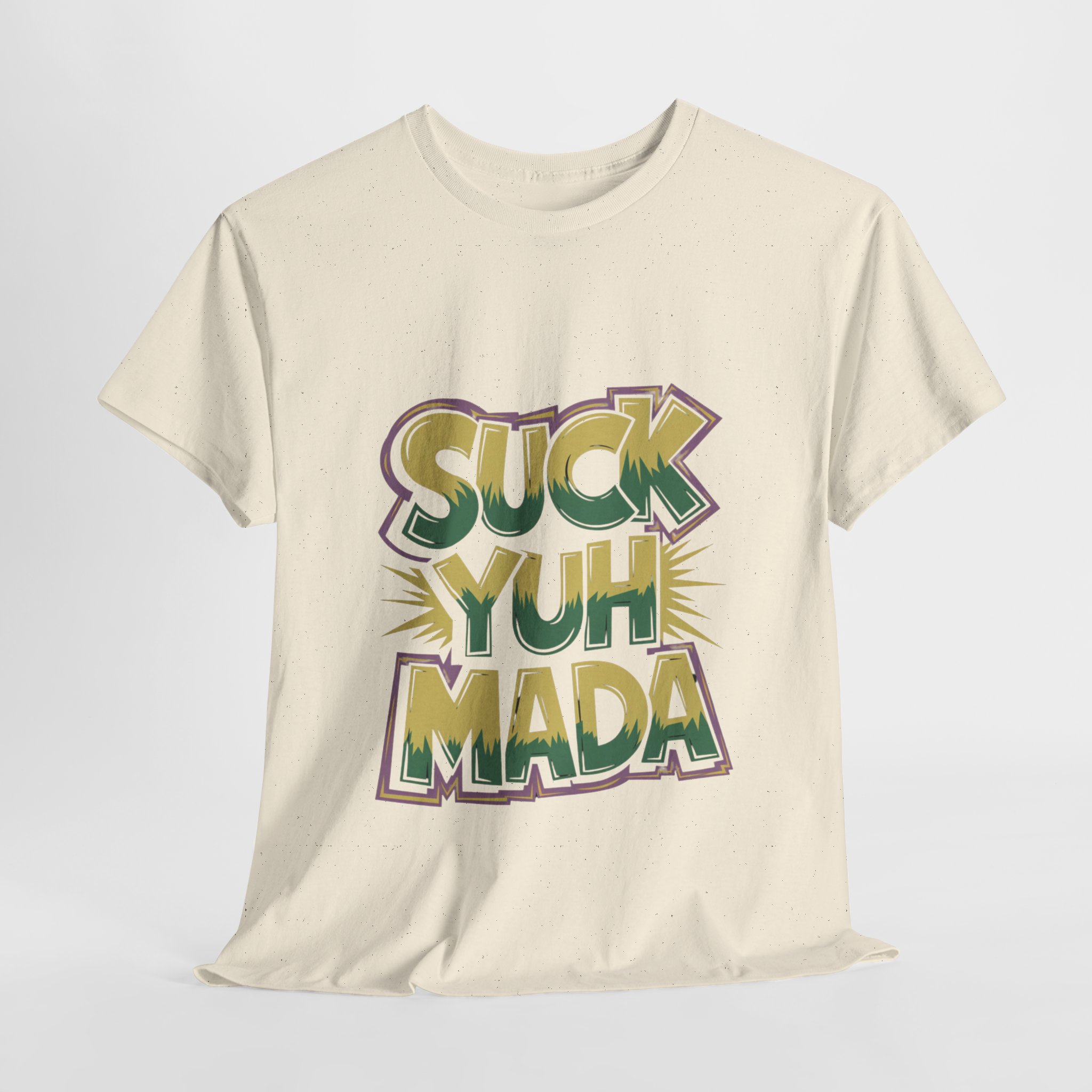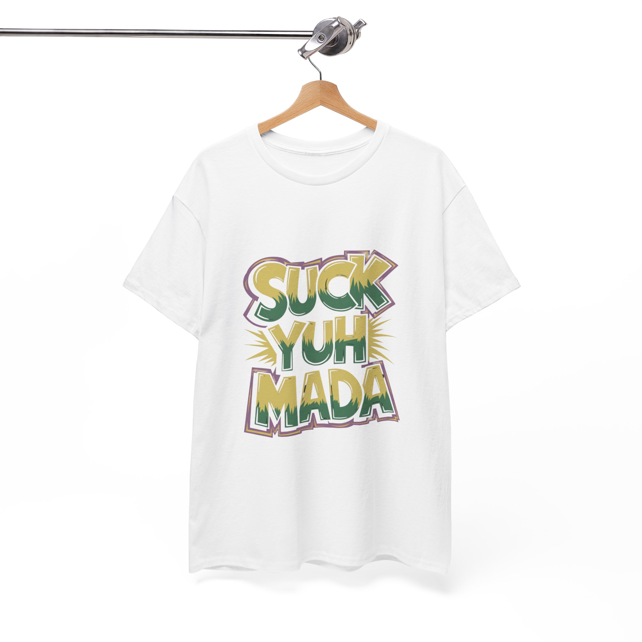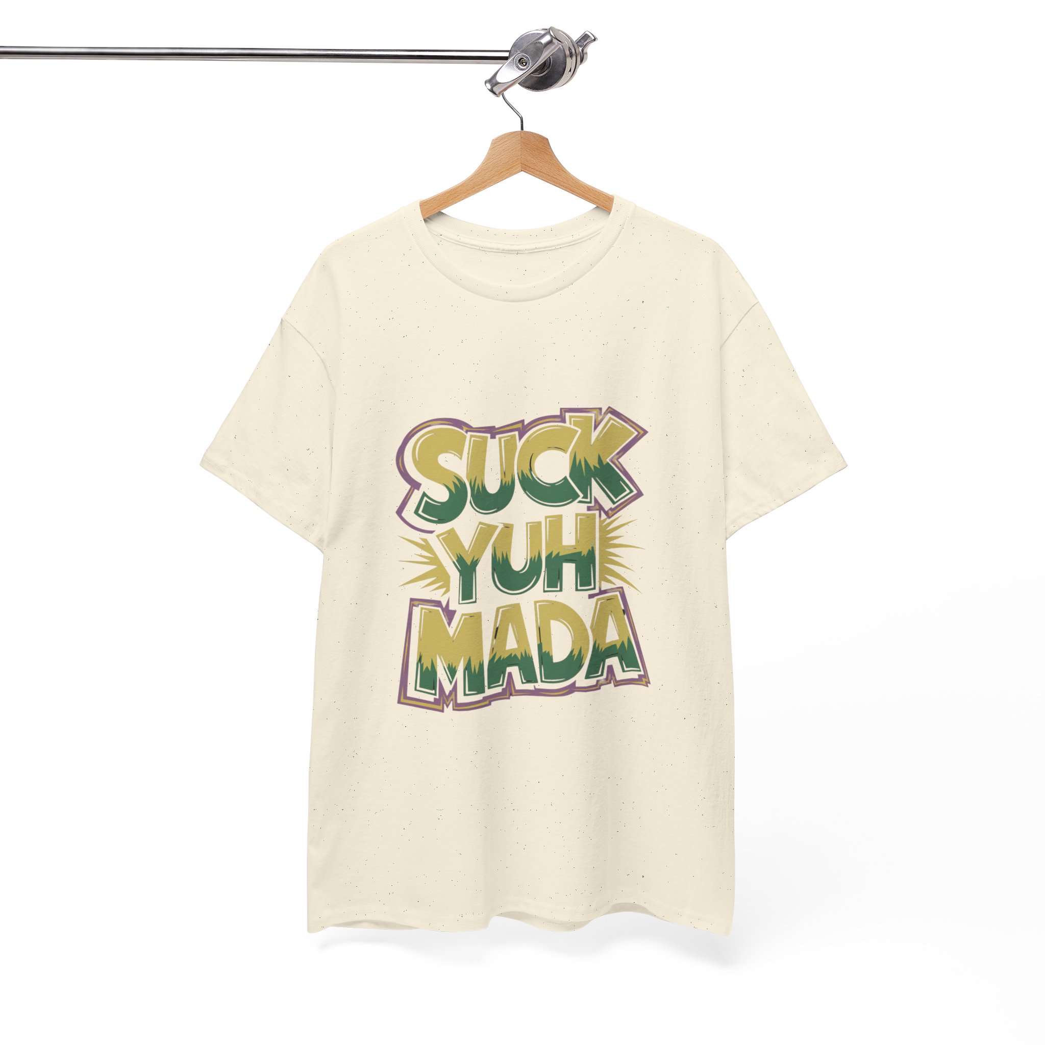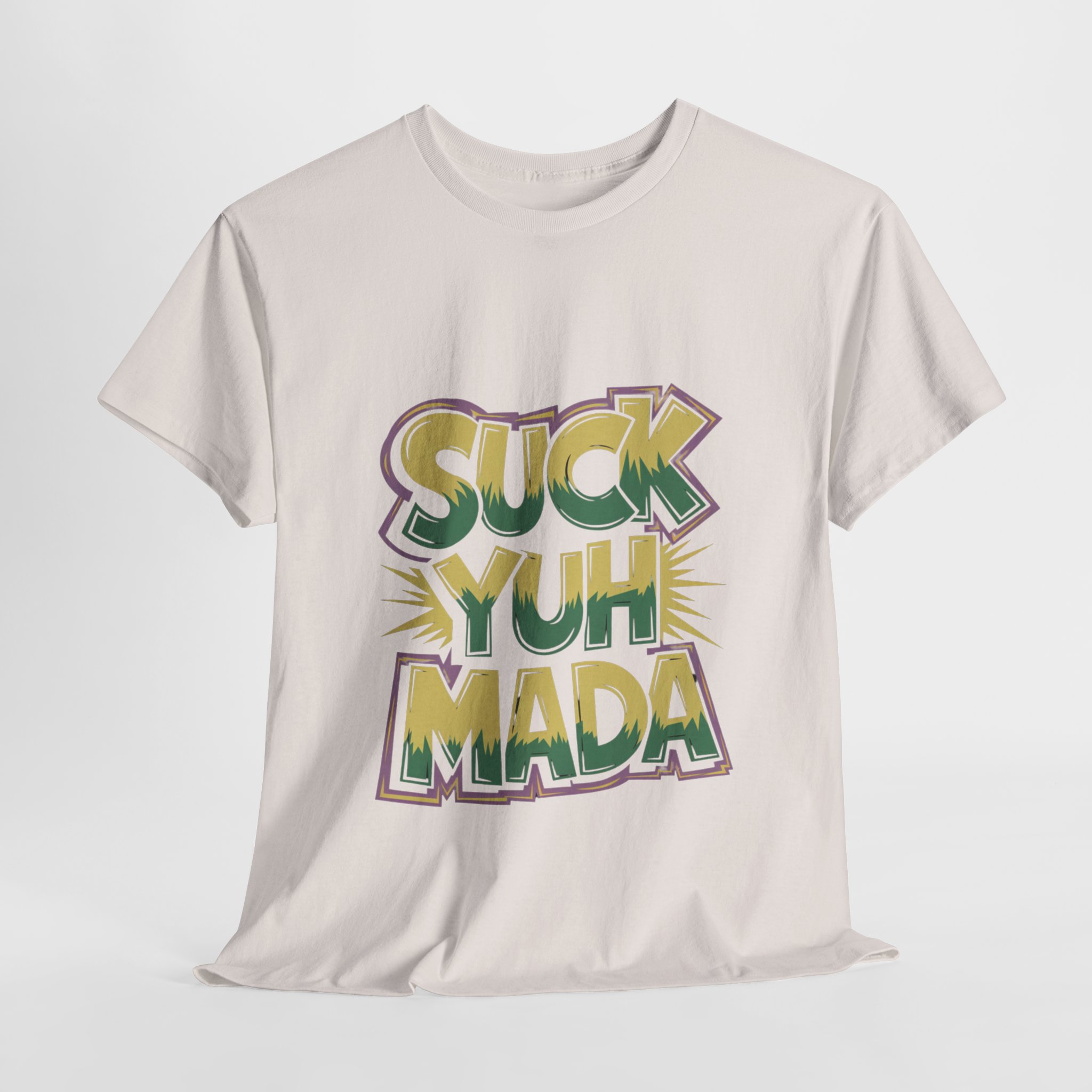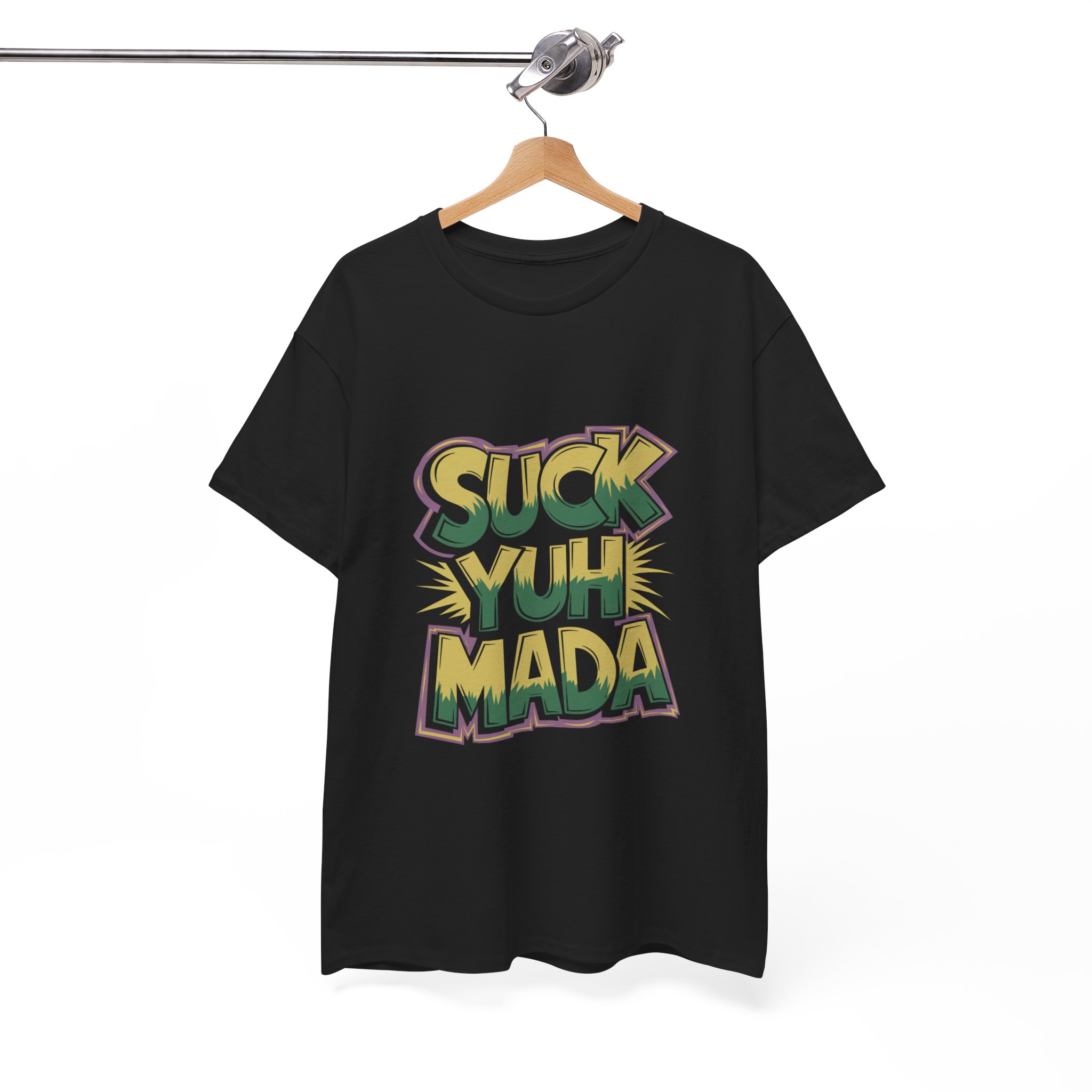 Bold and rebellious, the Suck Yuh Mada T-shirt features graffiti-inspired text in yellow, green, and purple, exuding an energetic vibe. Perfect for those who want to make a statement, this tee is ideal for casual wear and street style enthusiasts. Relevant for occasions where bold fashion choices are celebrated.