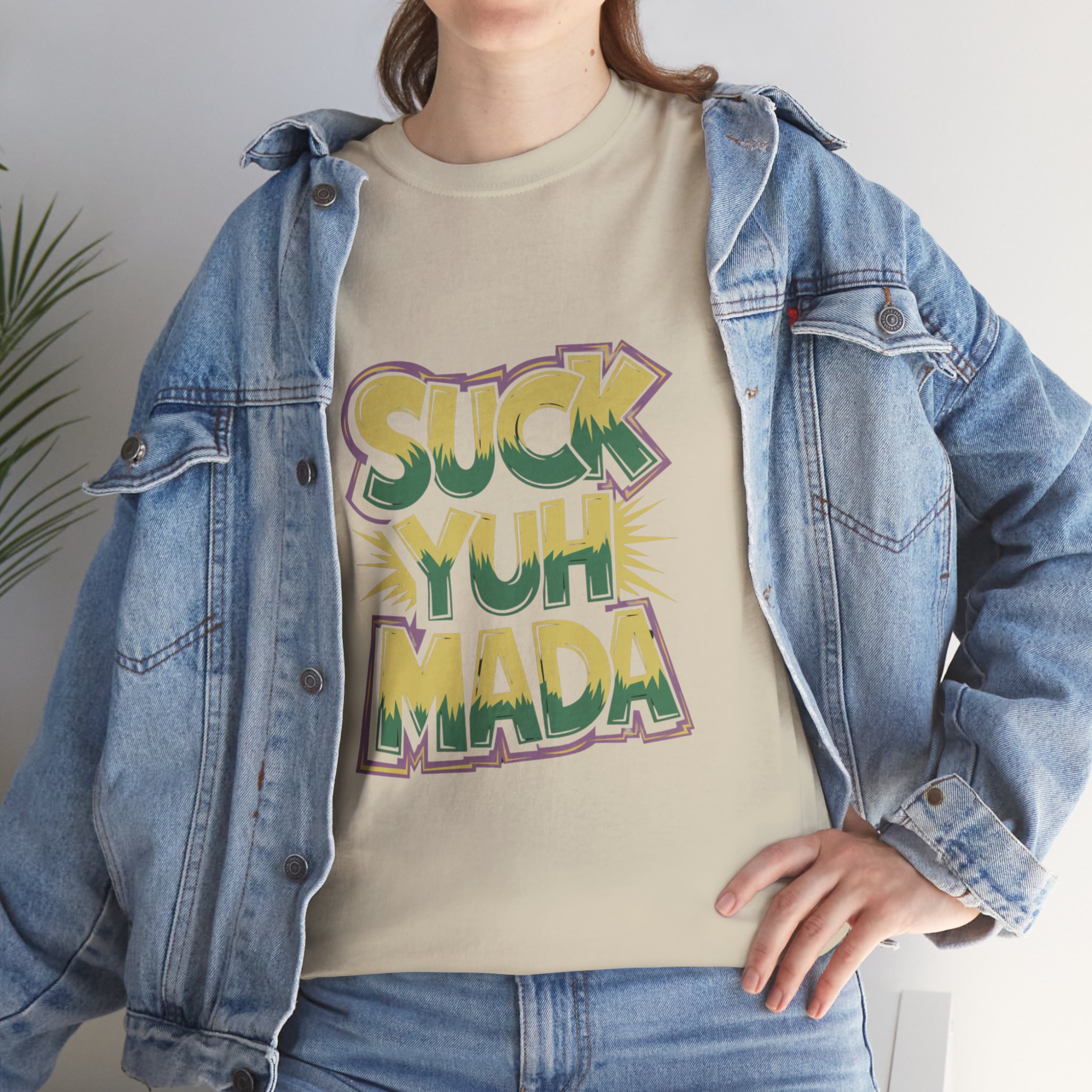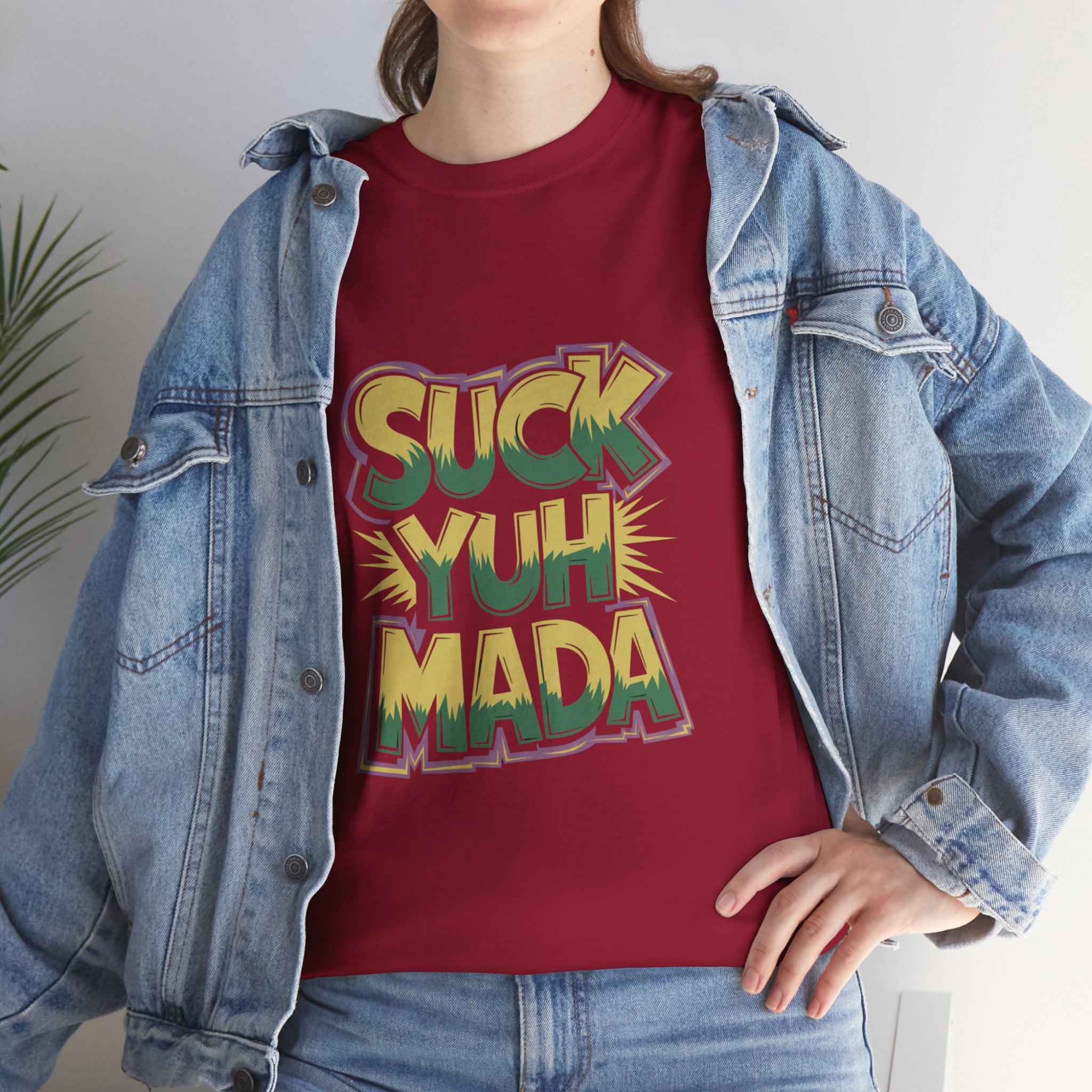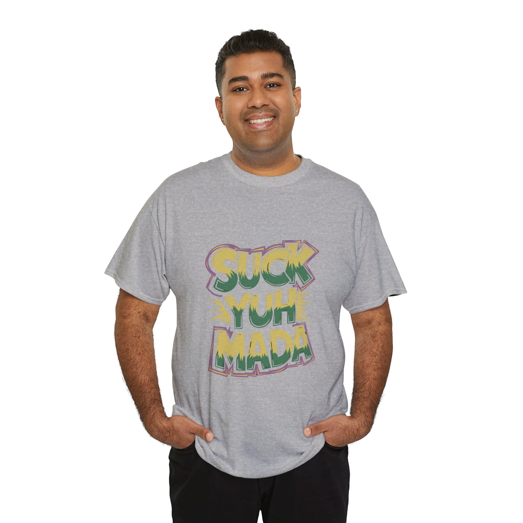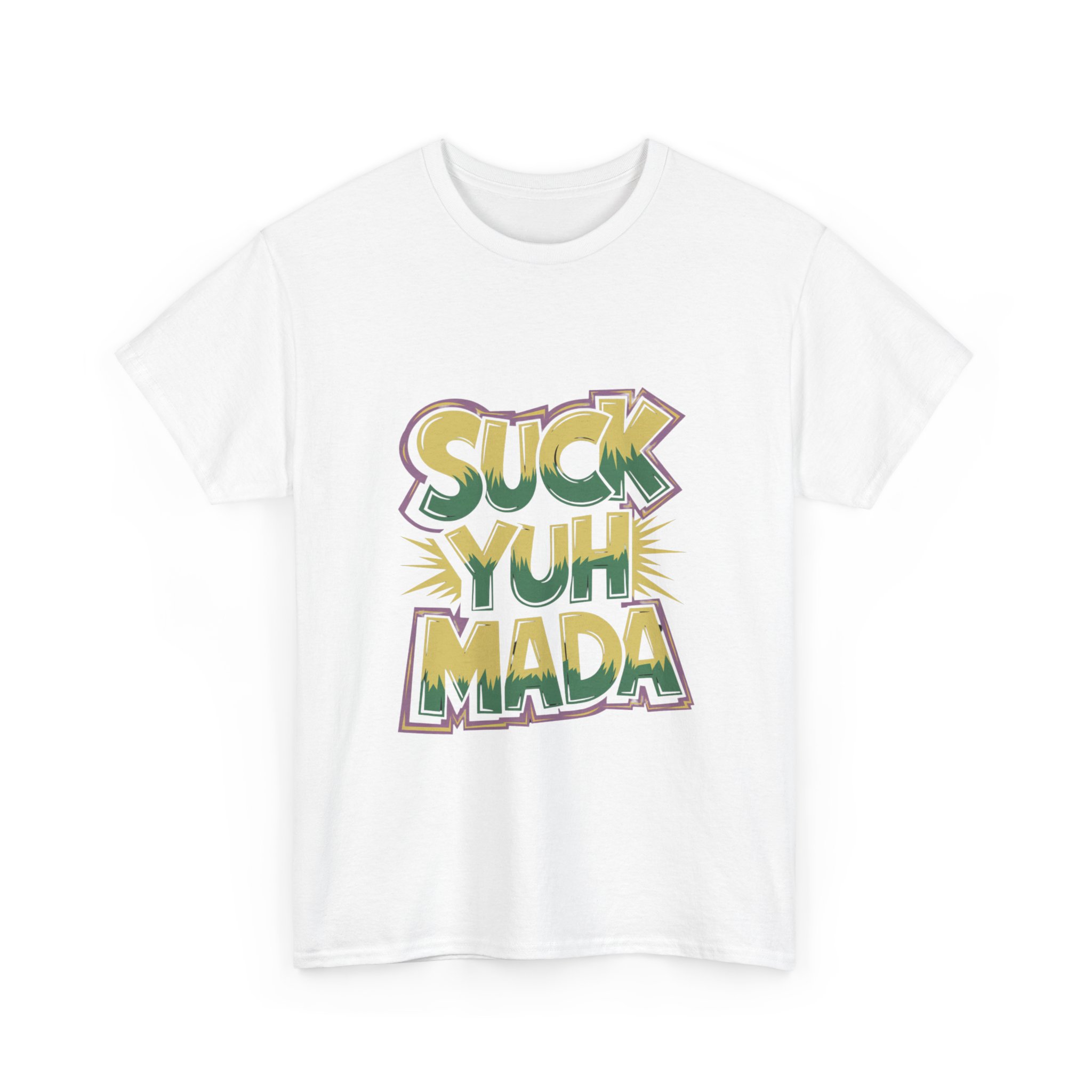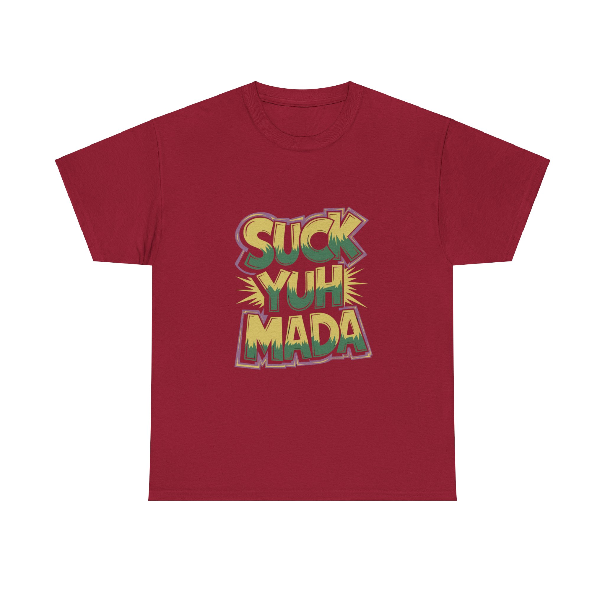 Bold and rebellious, the Suck Yuh Mada T-shirt features graffiti-inspired text in yellow, green, and purple, exuding an energetic vibe. Perfect for those who want to make a statement, this tee is ideal for casual wear and street style enthusiasts. Relevant for occasions where bold fashion choices are celebrated.