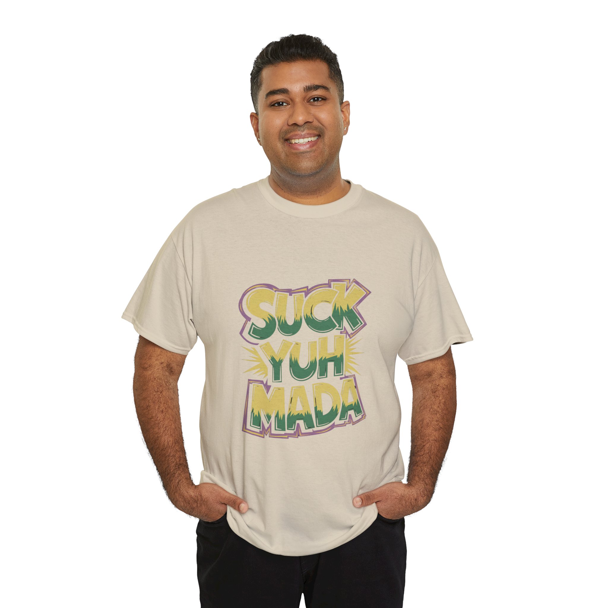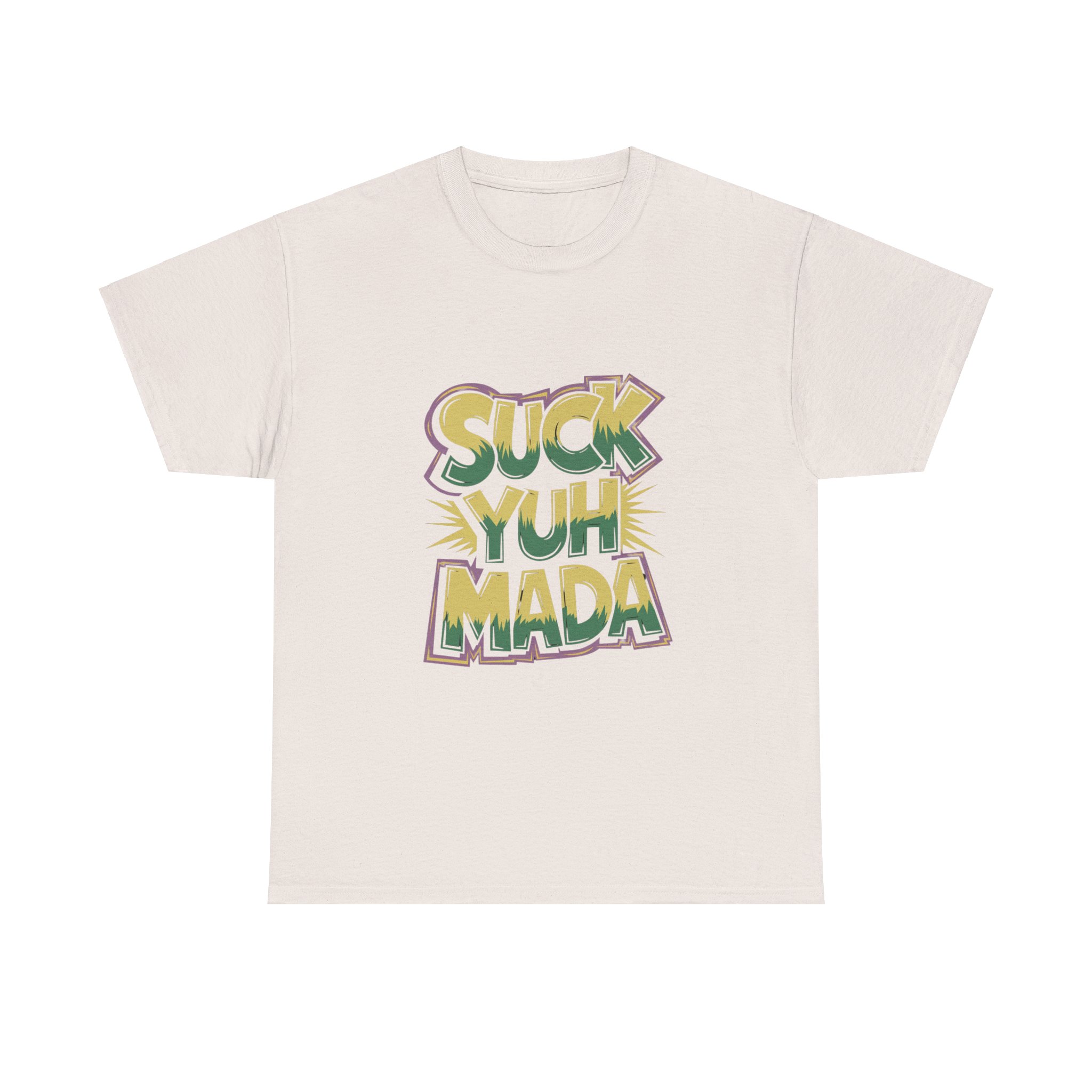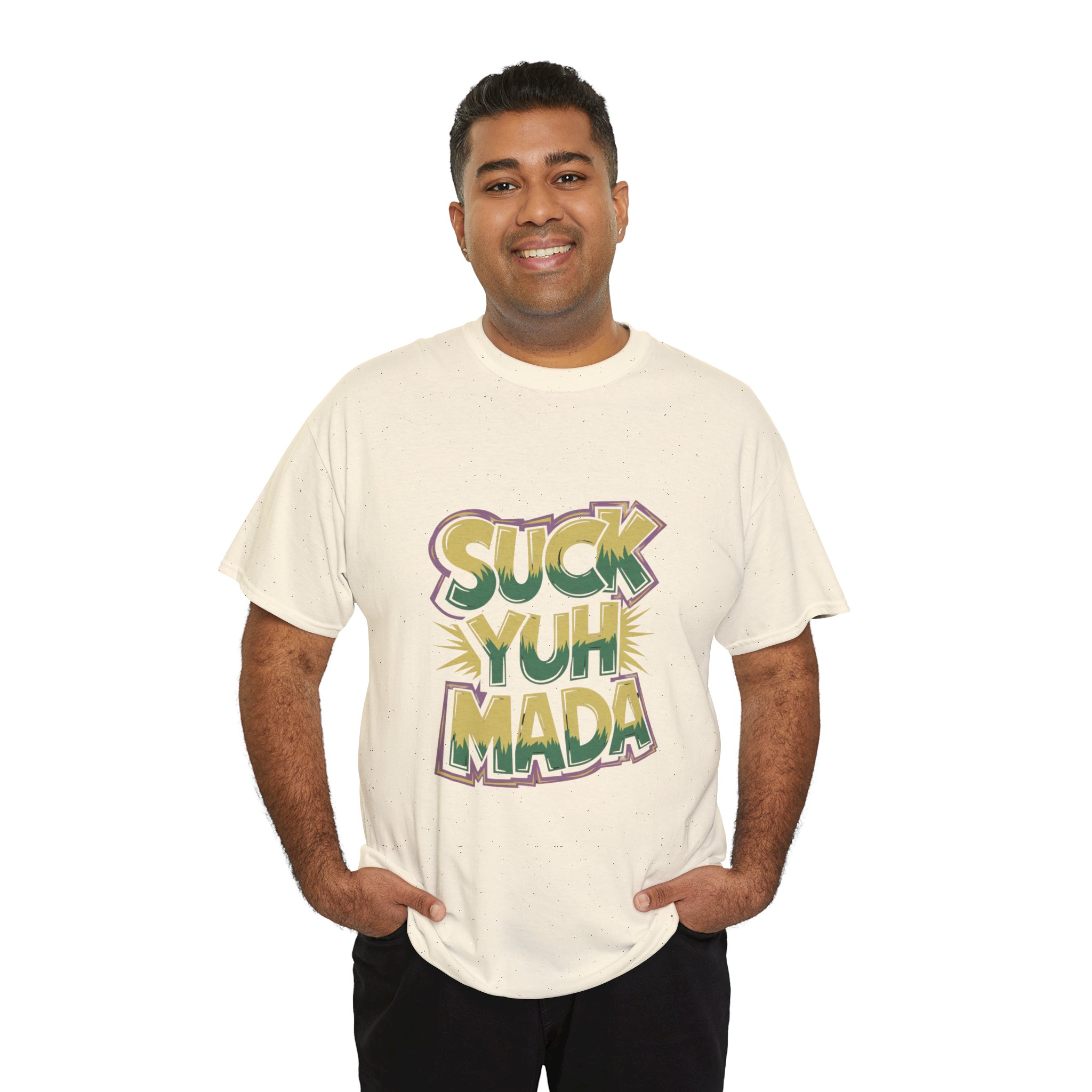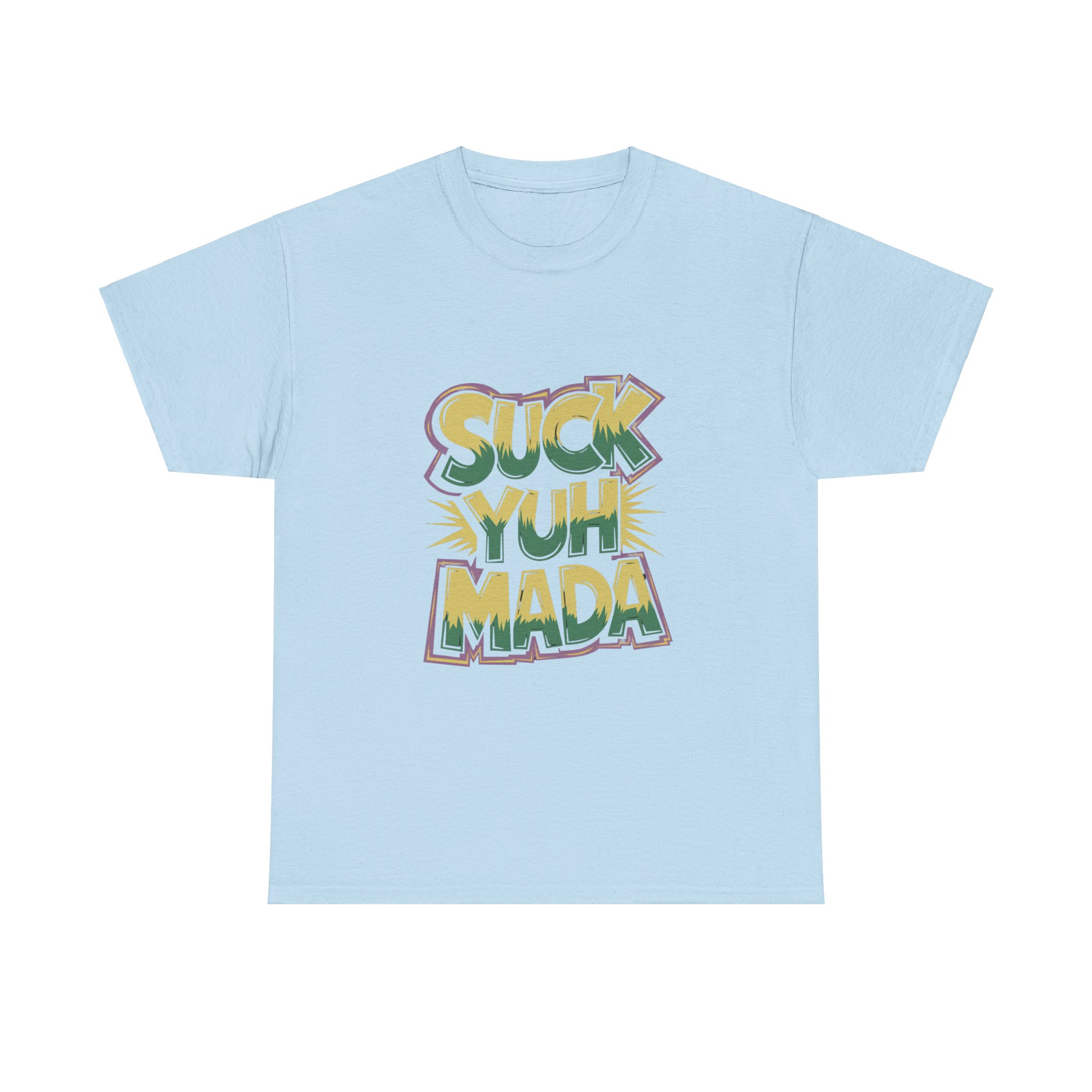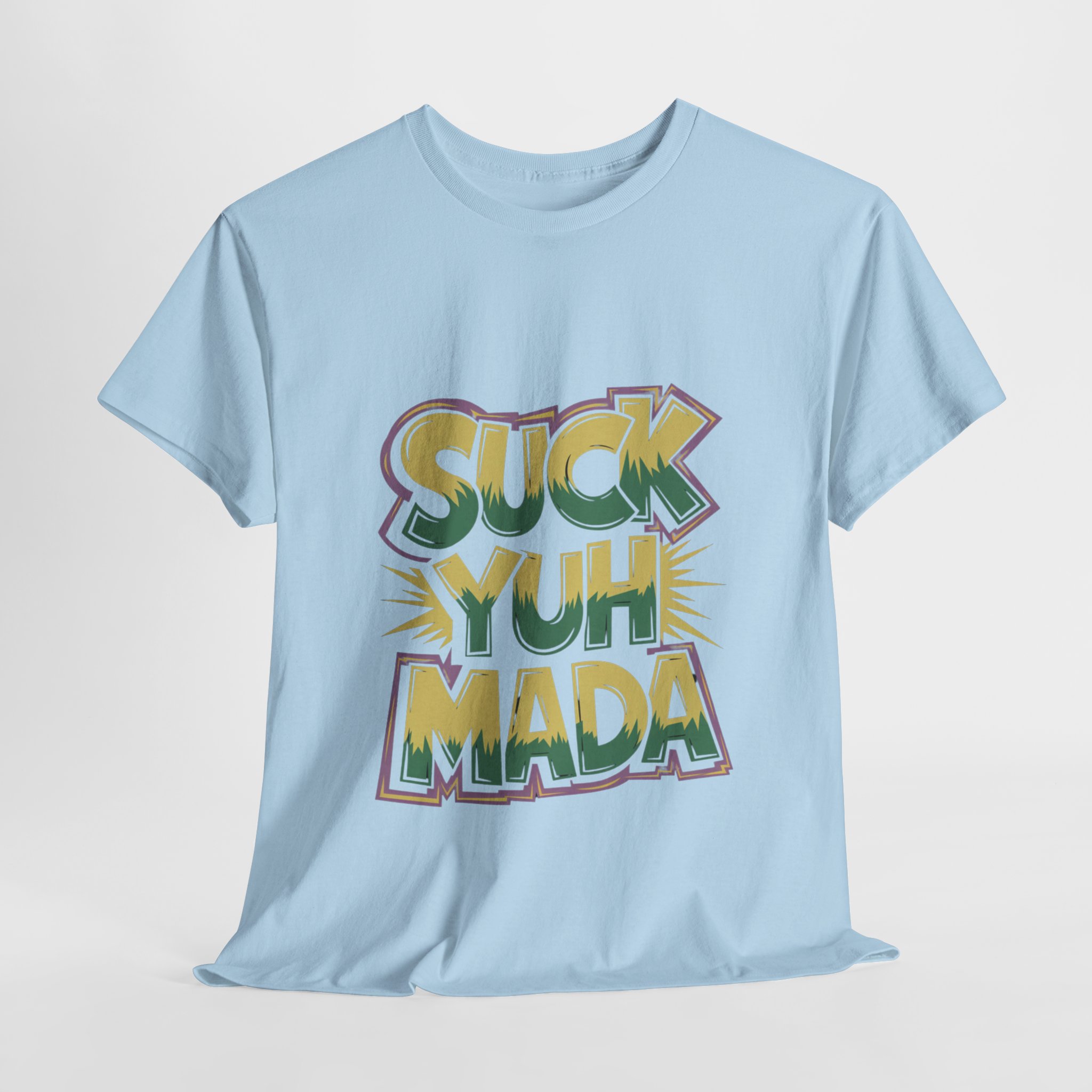 Bold and rebellious, the Suck Yuh Mada T-shirt features graffiti-inspired text in yellow, green, and purple, exuding an energetic vibe. Perfect for those who want to make a statement, this tee is ideal for casual wear and street style enthusiasts. Relevant for occasions where bold fashion choices are celebrated.