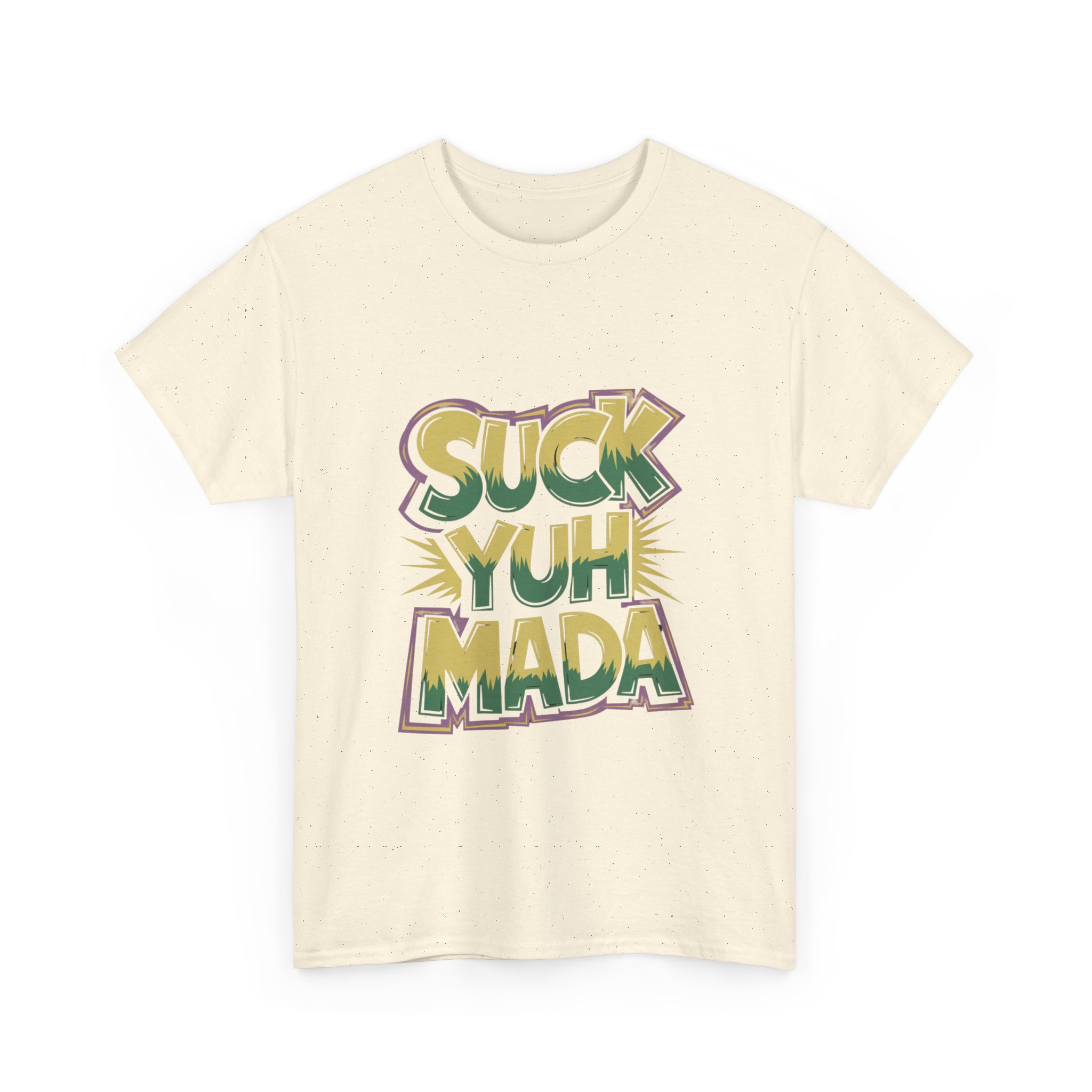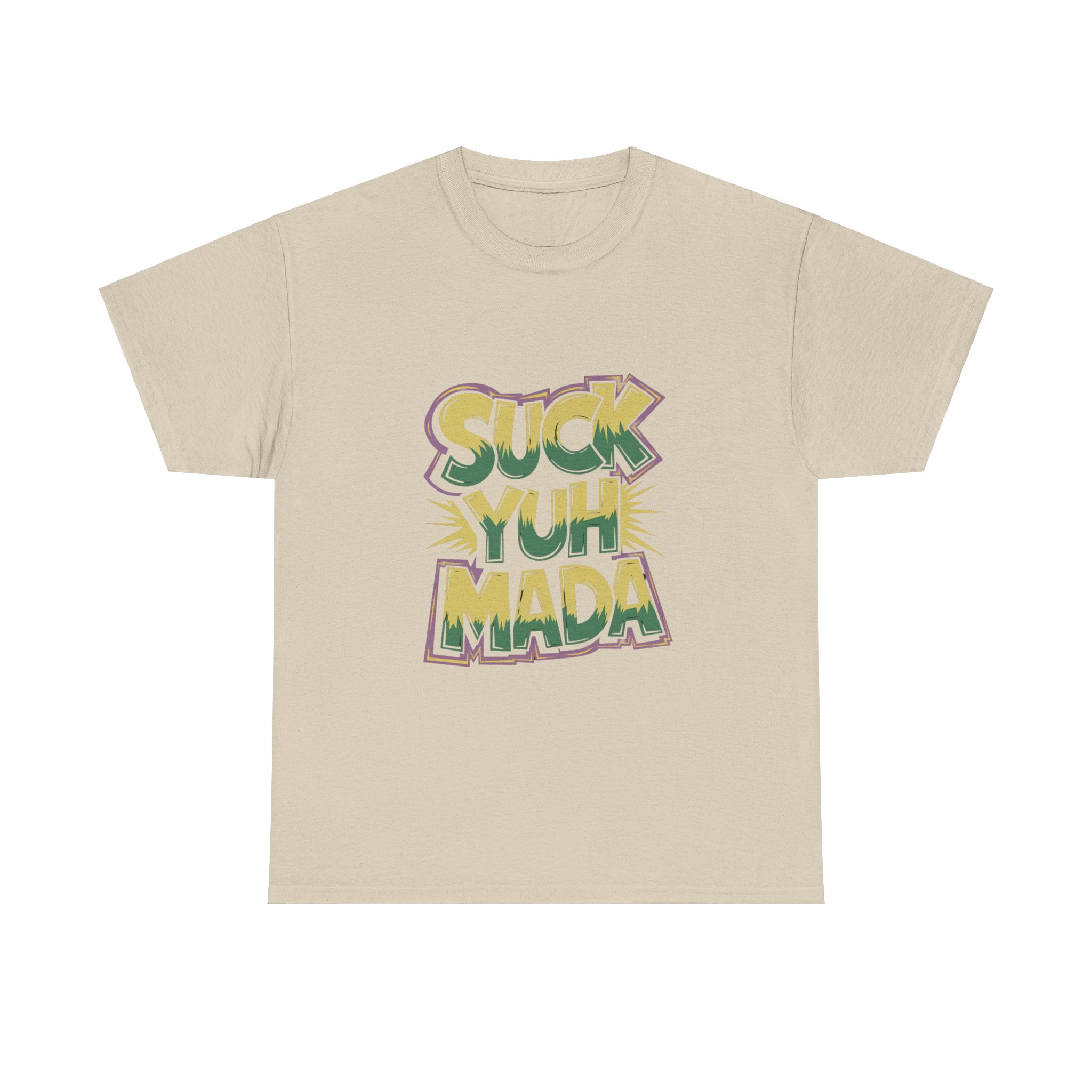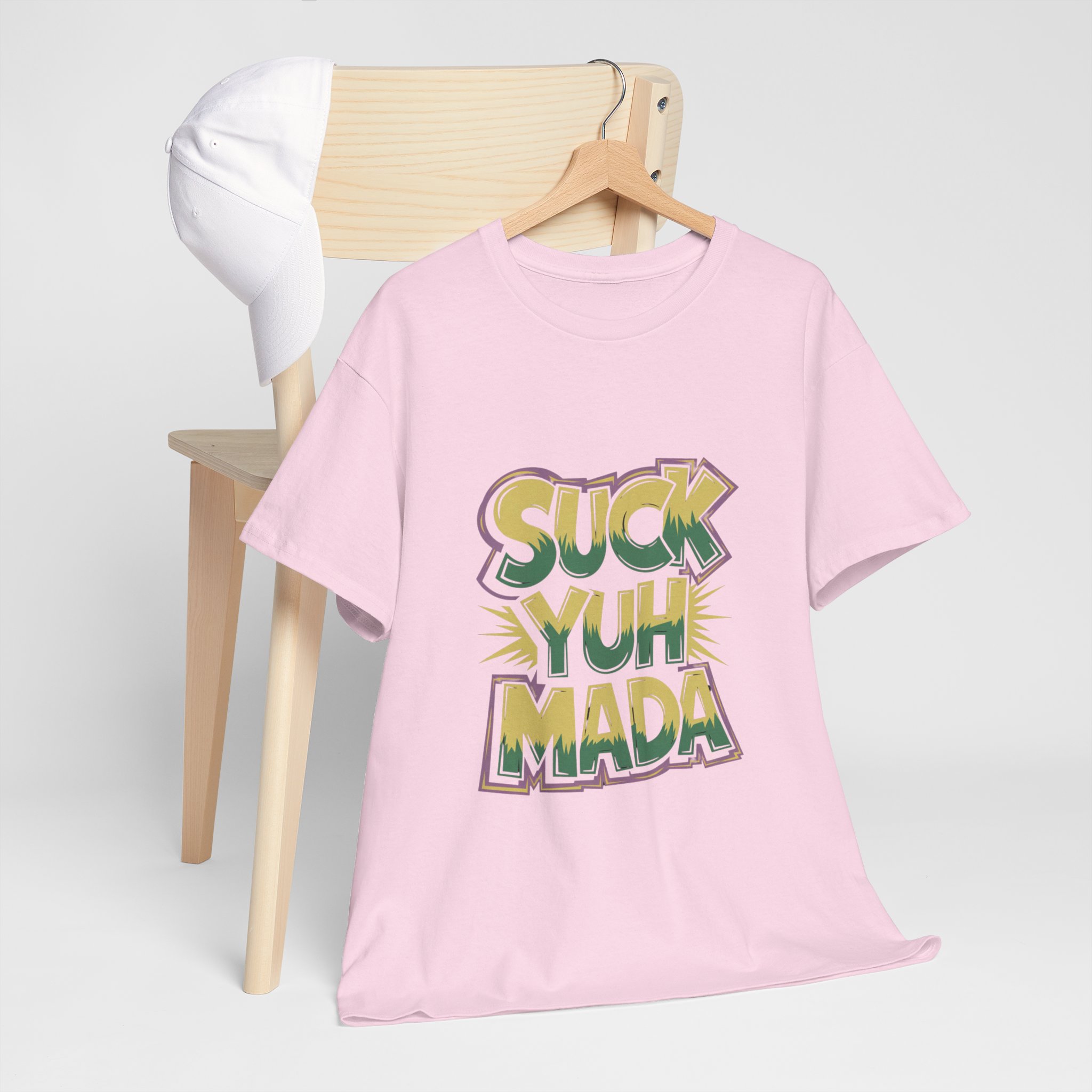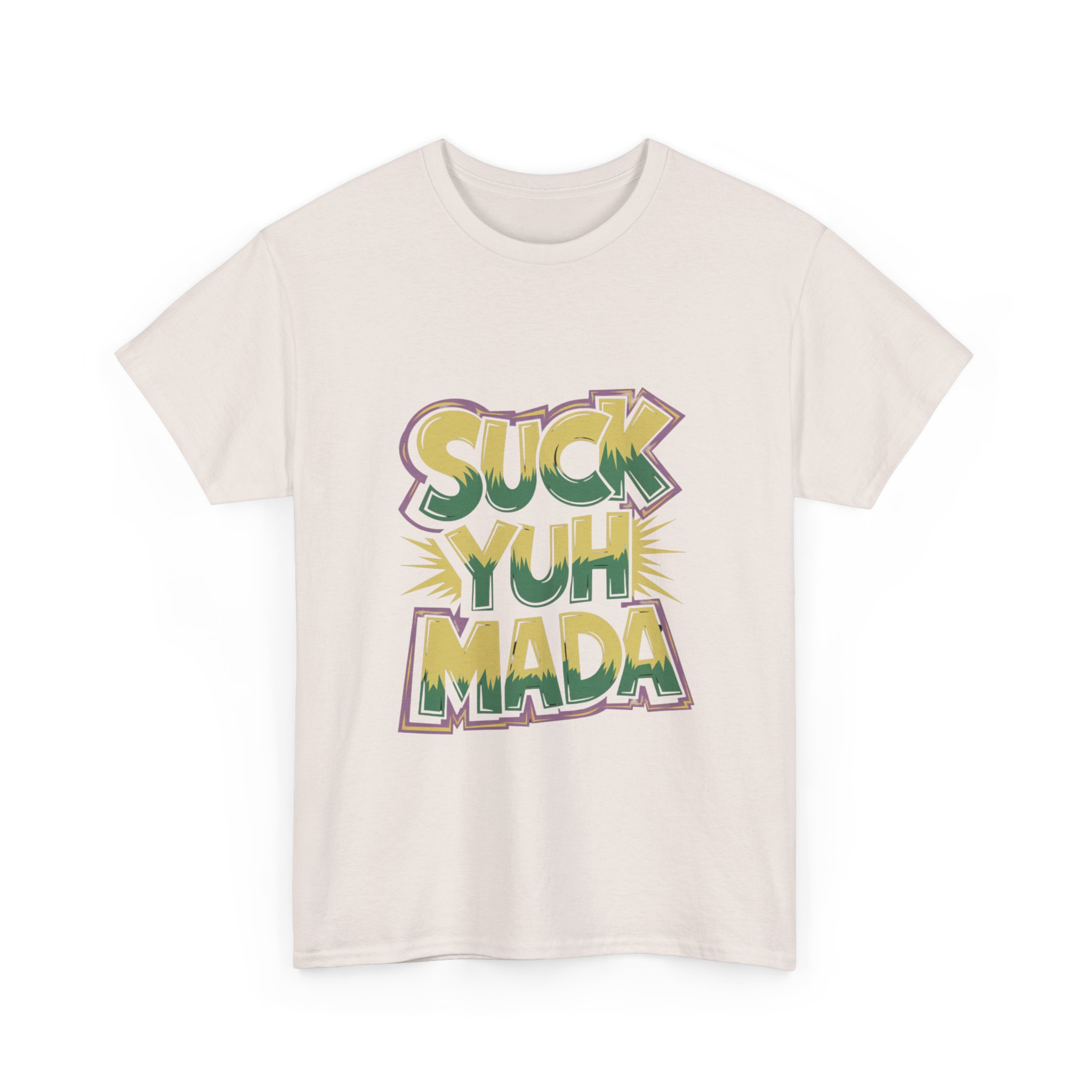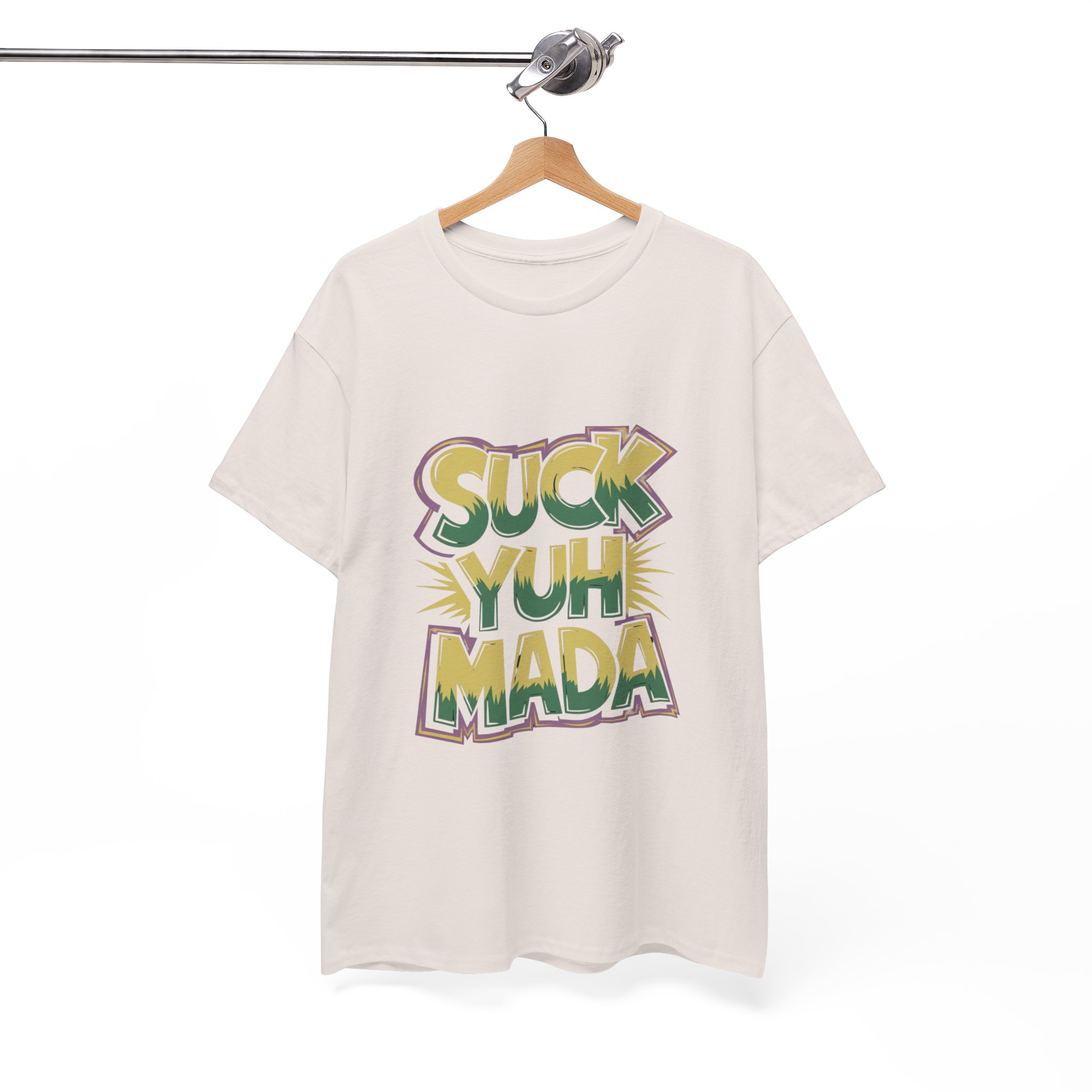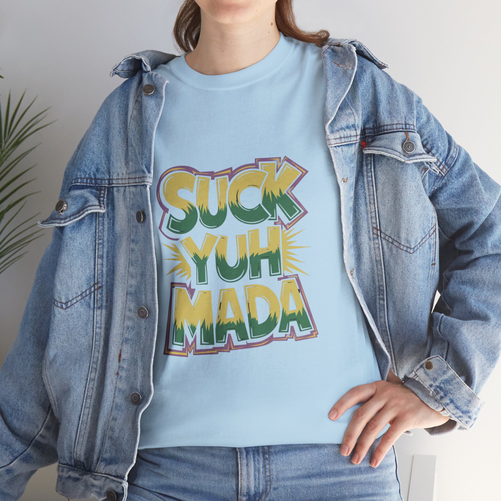 Bold and rebellious, the Suck Yuh Mada T-shirt features graffiti-inspired text in yellow, green, and purple, exuding an energetic vibe. Perfect for those who want to make a statement, this tee is ideal for casual wear and street style enthusiasts. Relevant for occasions where bold fashion choices are celebrated.