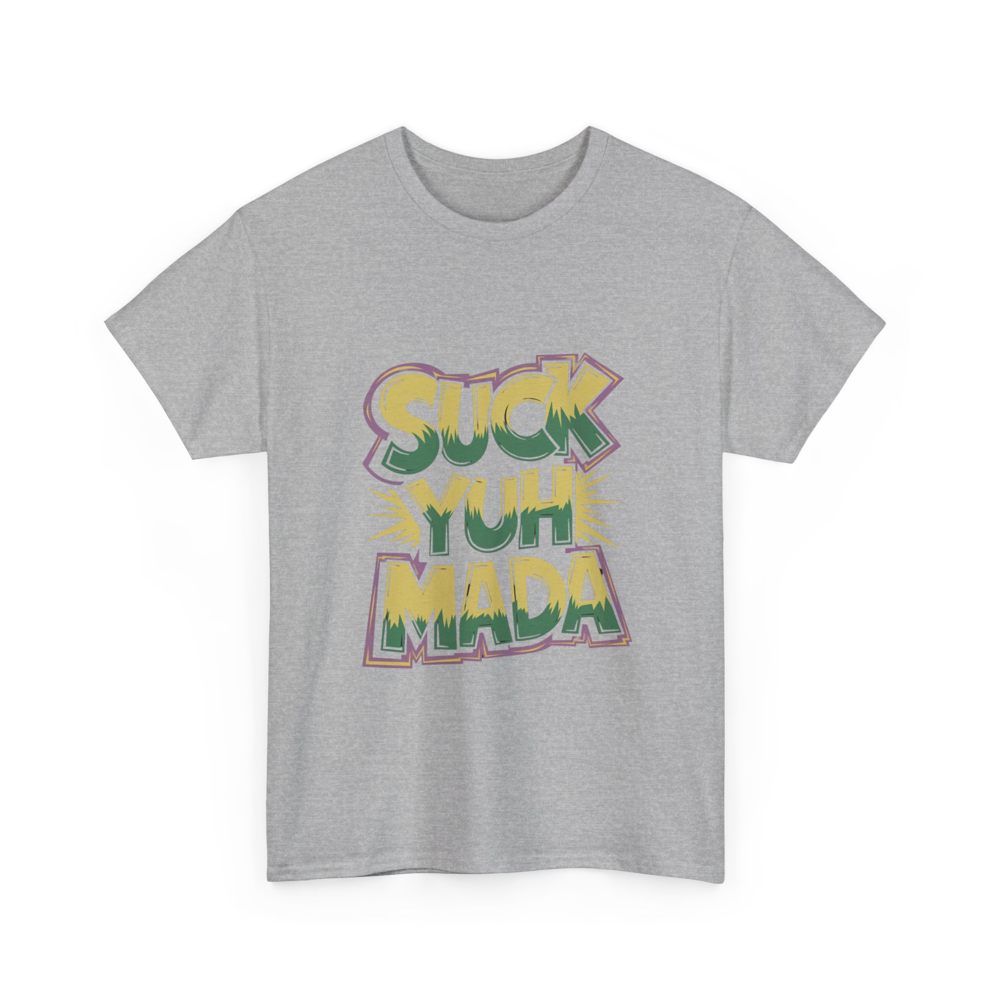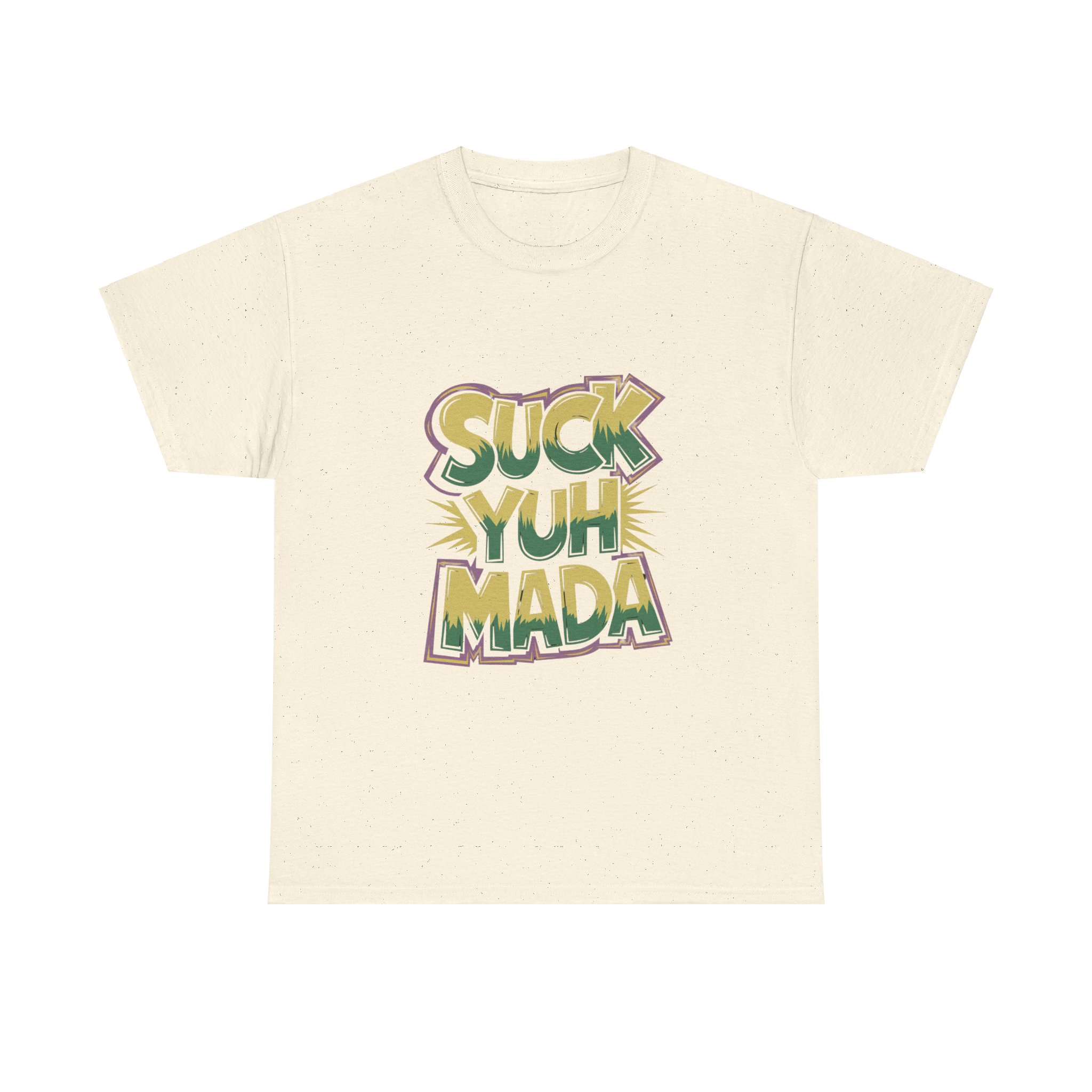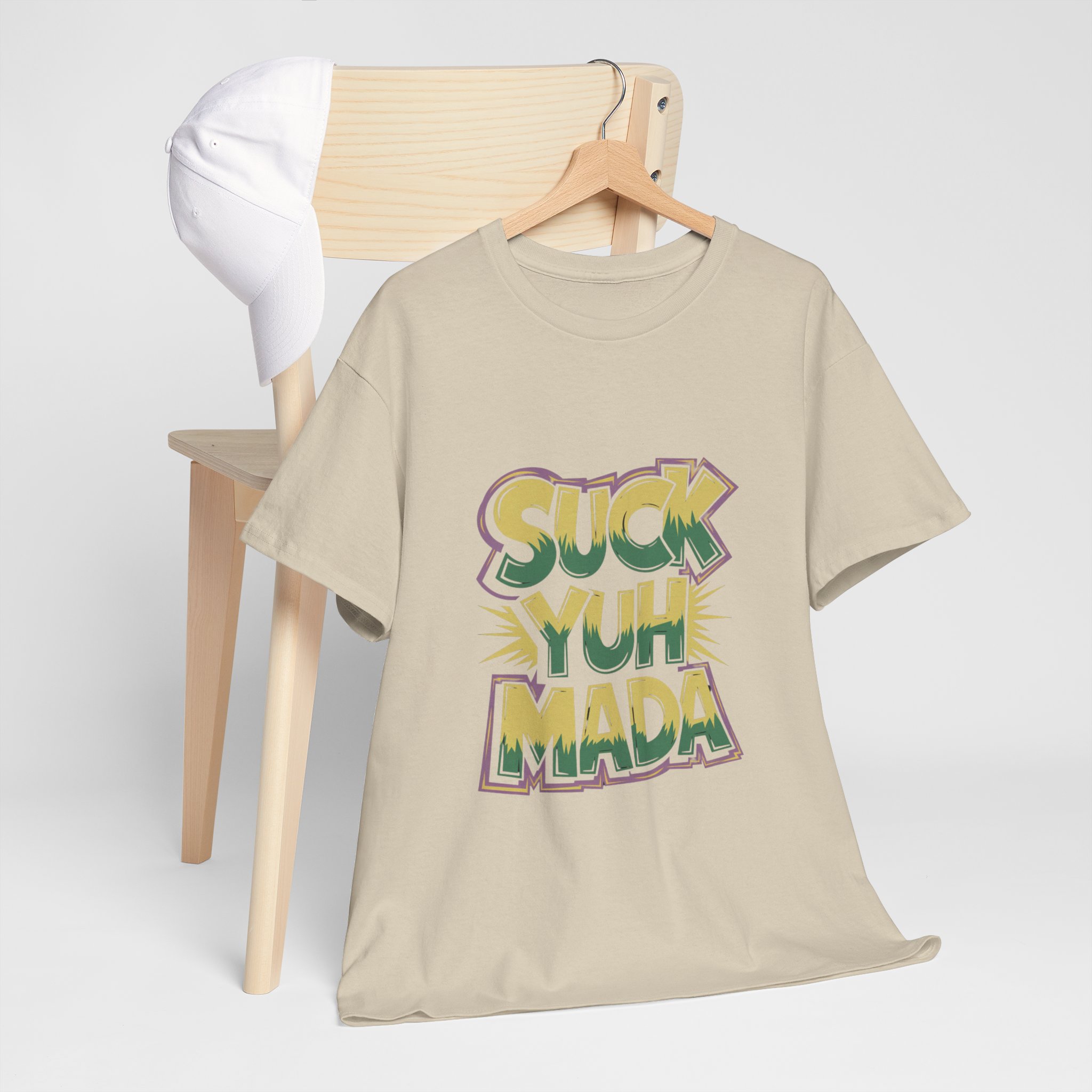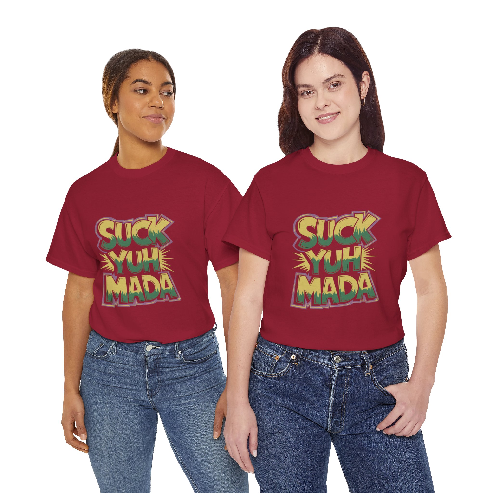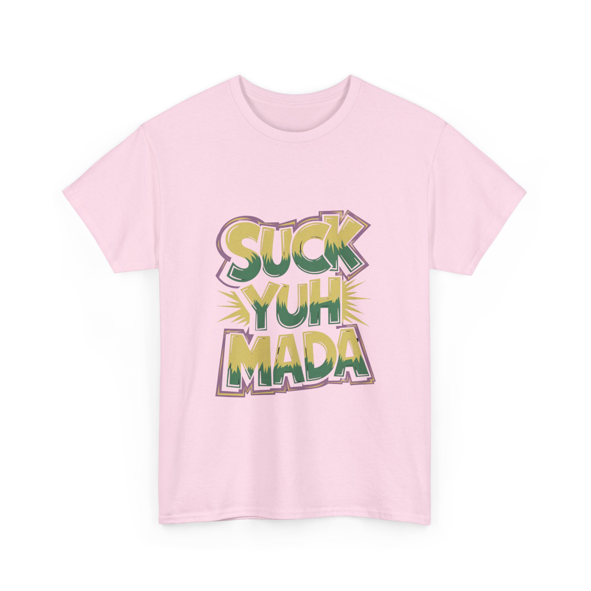 Bold and rebellious, the Suck Yuh Mada T-shirt features graffiti-inspired text in yellow, green, and purple, exuding an energetic vibe. Perfect for those who want to make a statement, this tee is ideal for casual wear and street style enthusiasts. Relevant for occasions where bold fashion choices are celebrated.