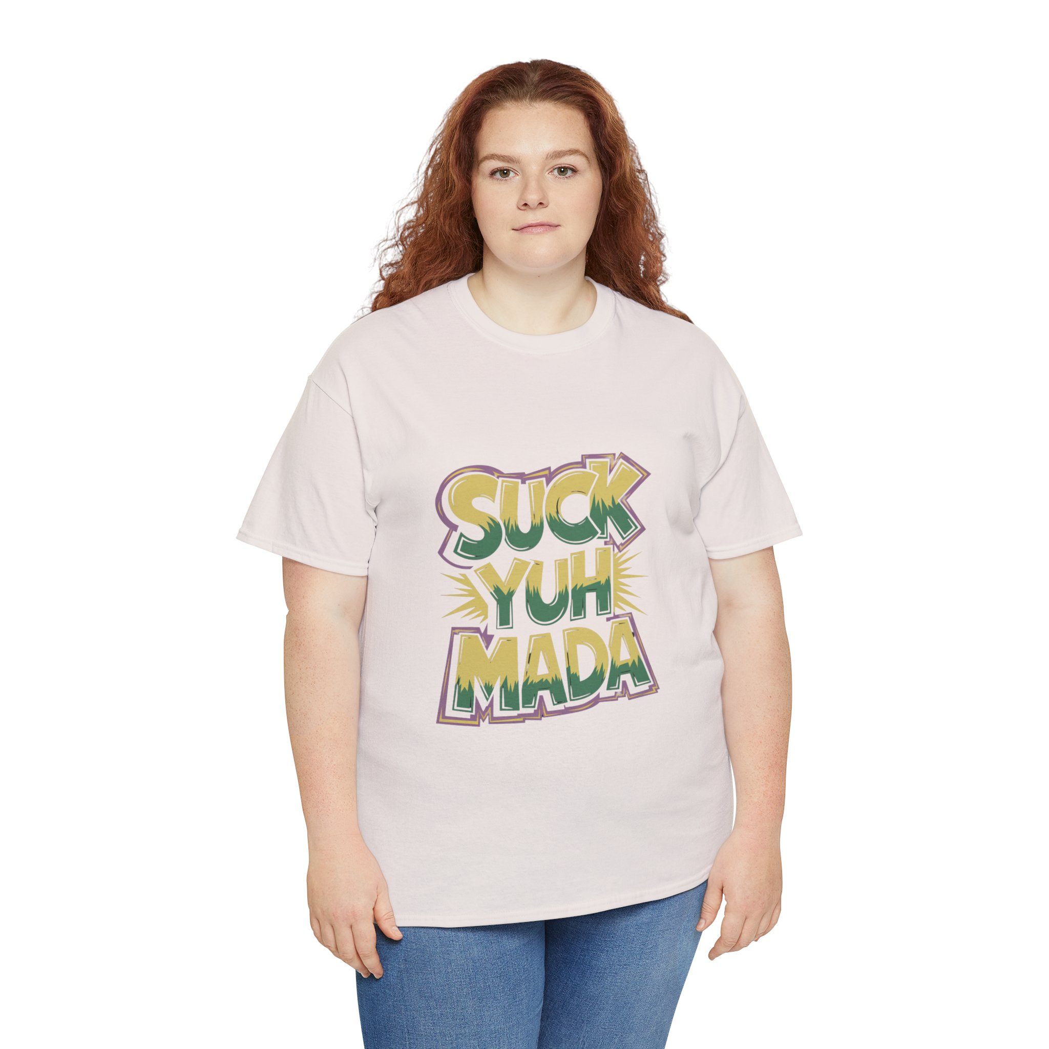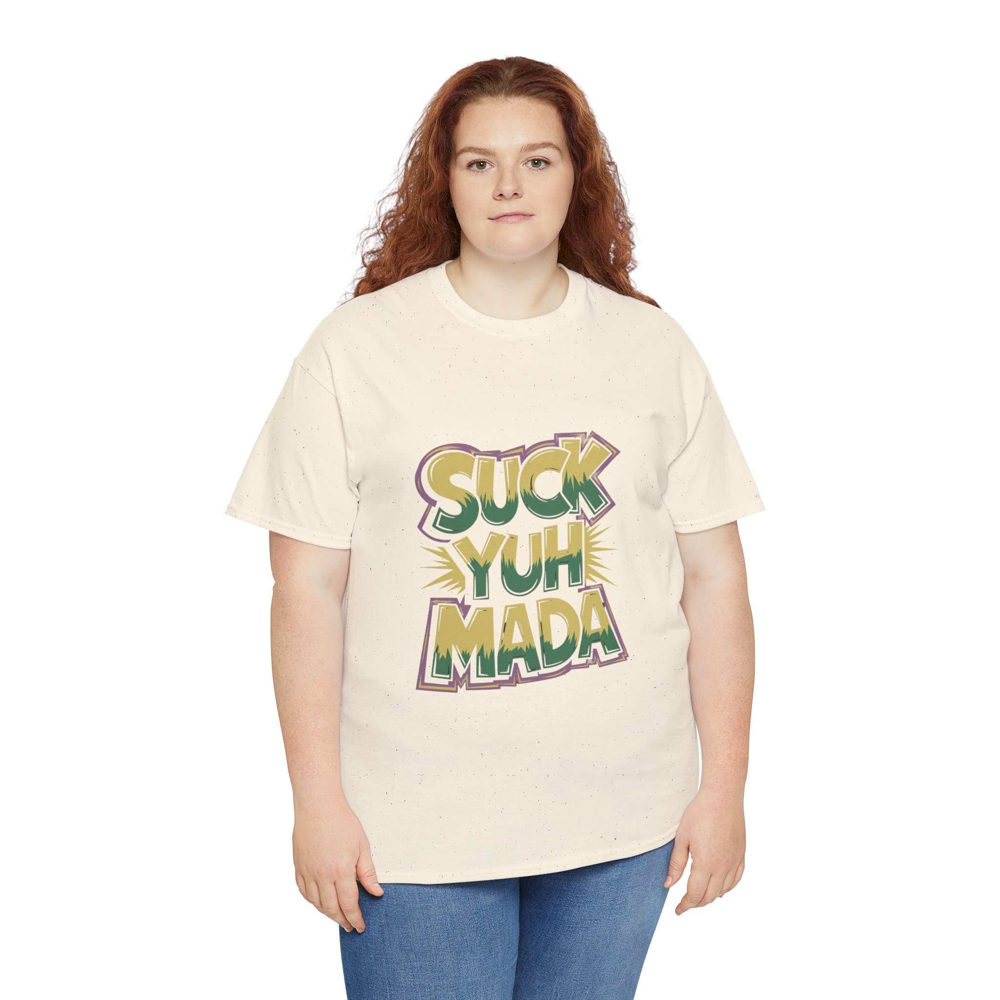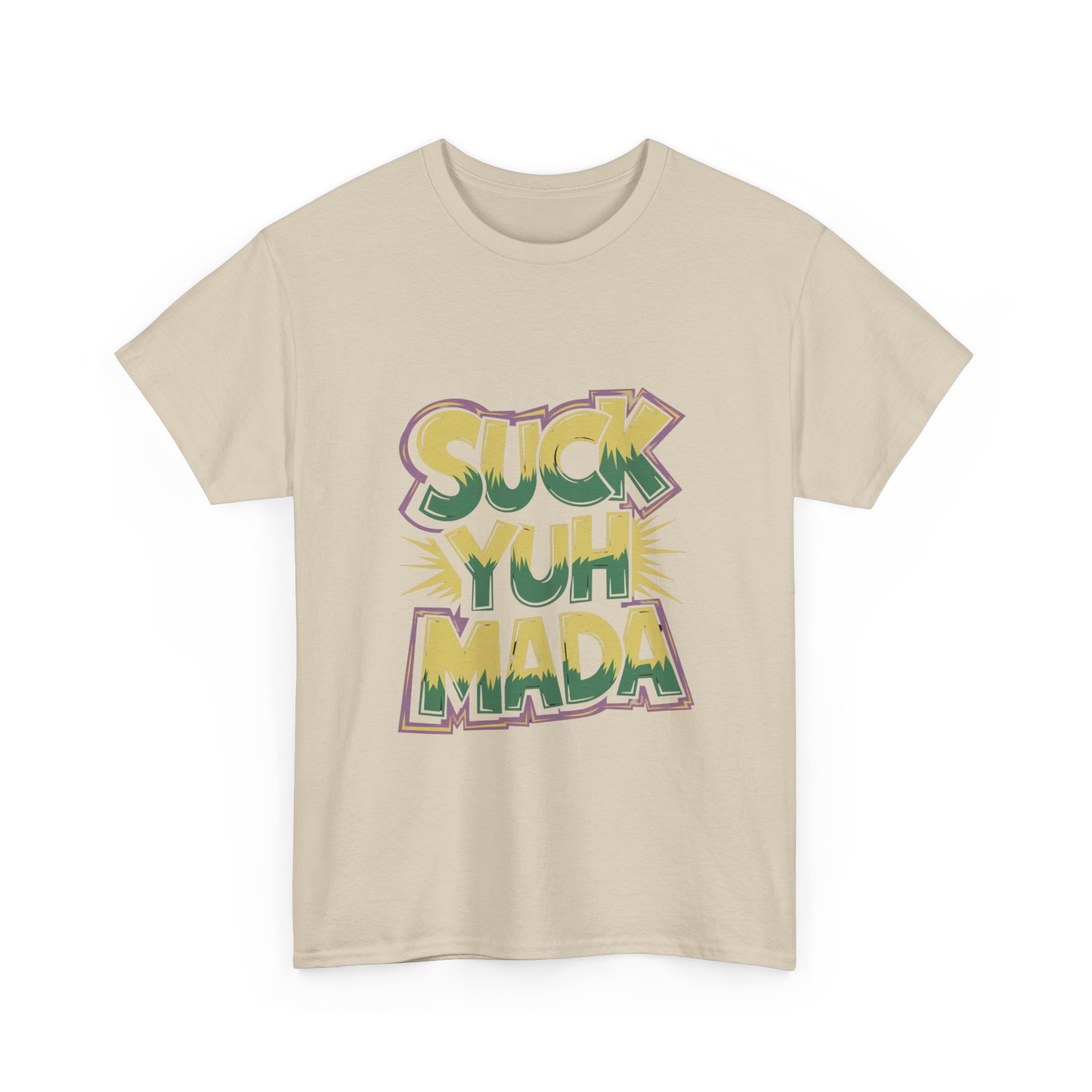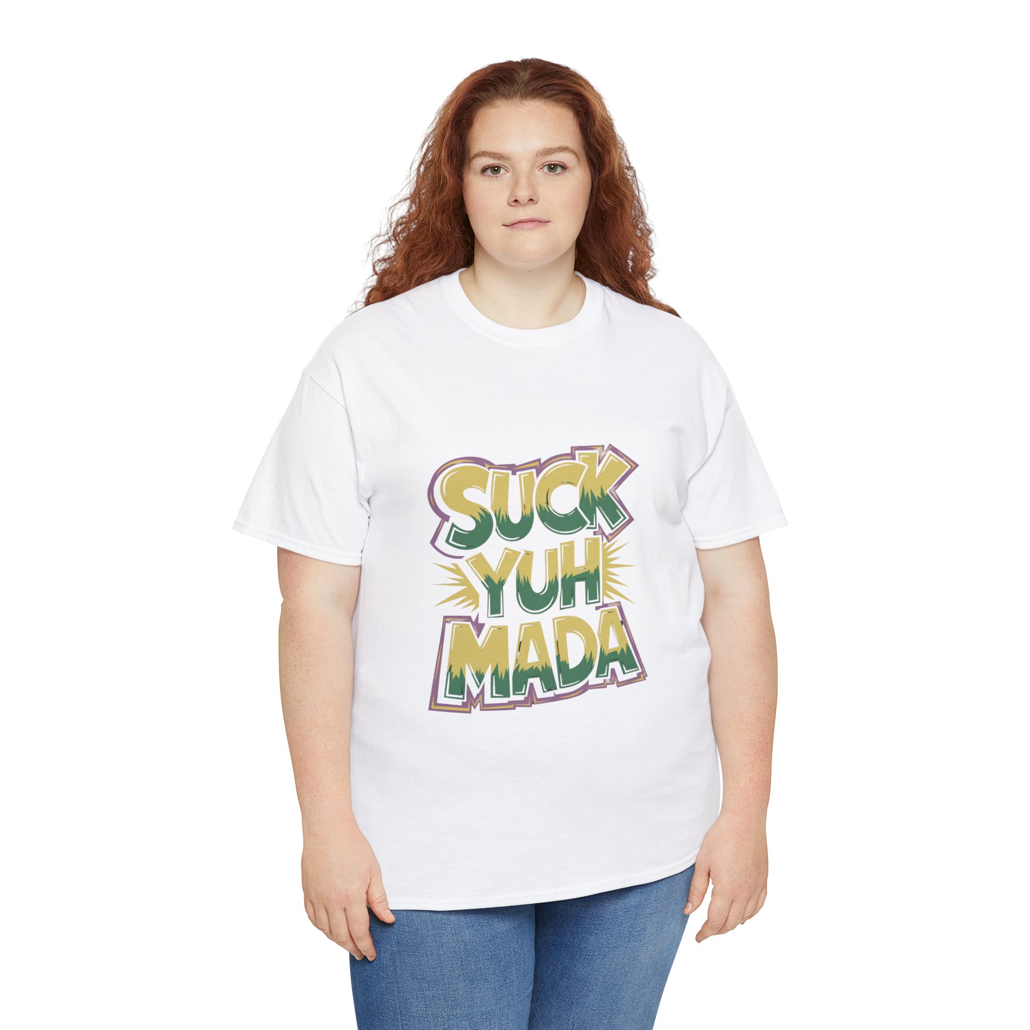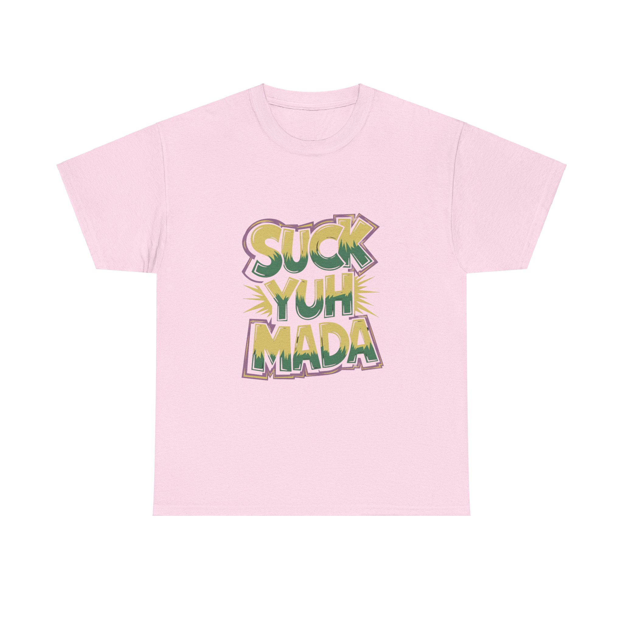 Bold and rebellious, the Suck Yuh Mada T-shirt features graffiti-inspired text in yellow, green, and purple, exuding an energetic vibe. Perfect for those who want to make a statement, this tee is ideal for casual wear and street style enthusiasts. Relevant for occasions where bold fashion choices are celebrated.