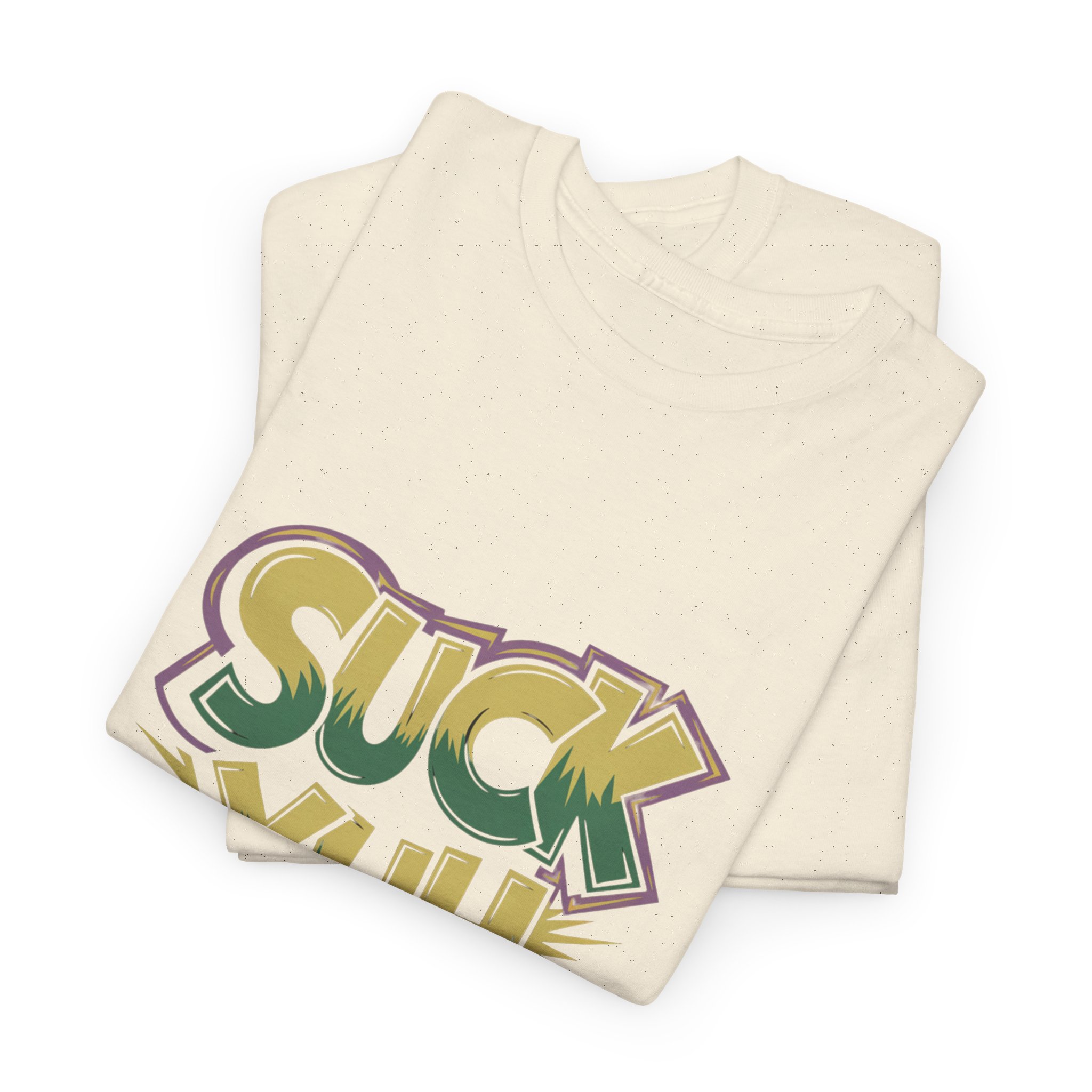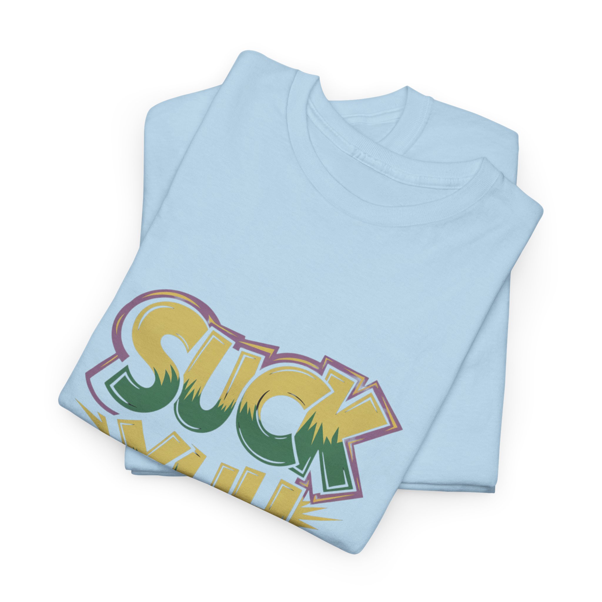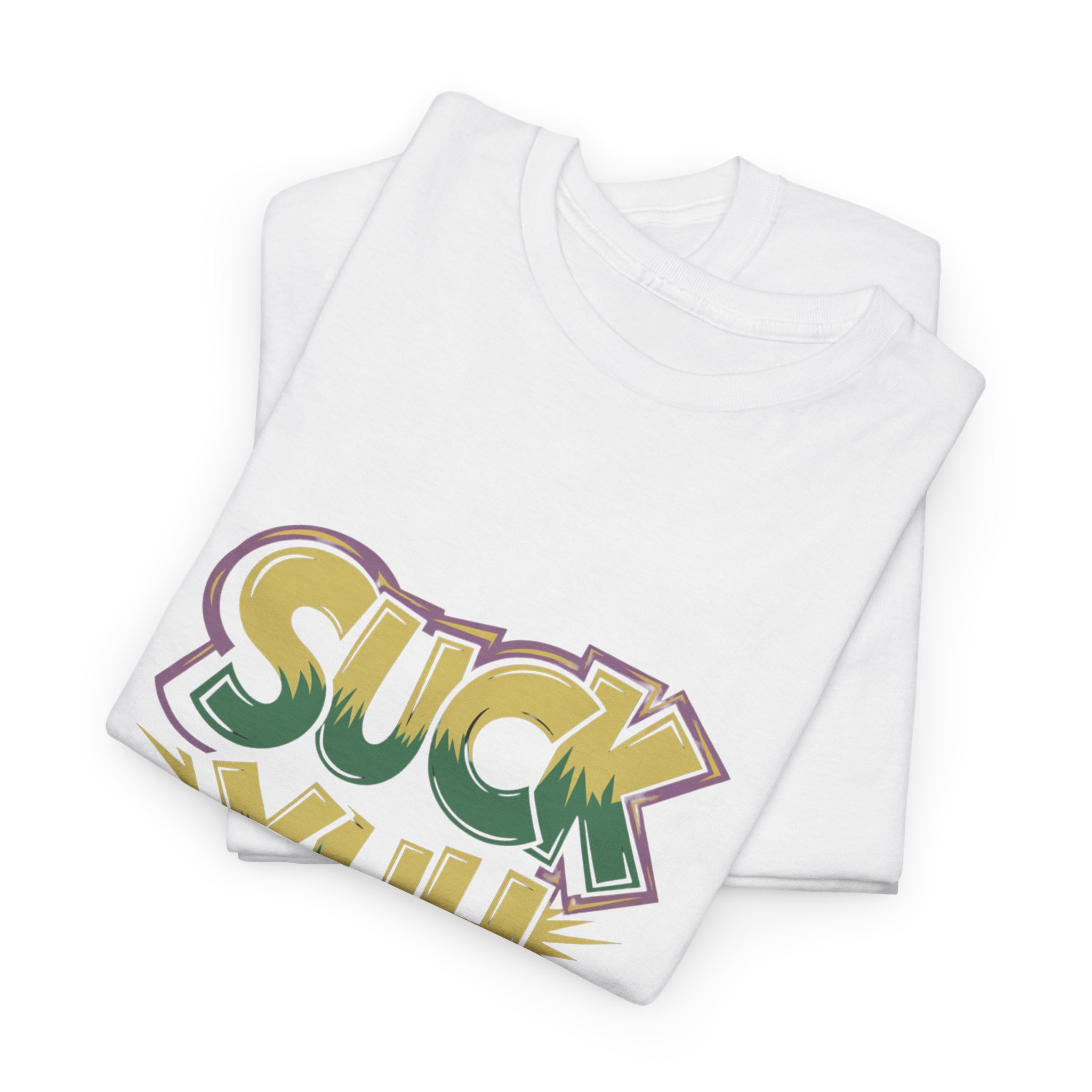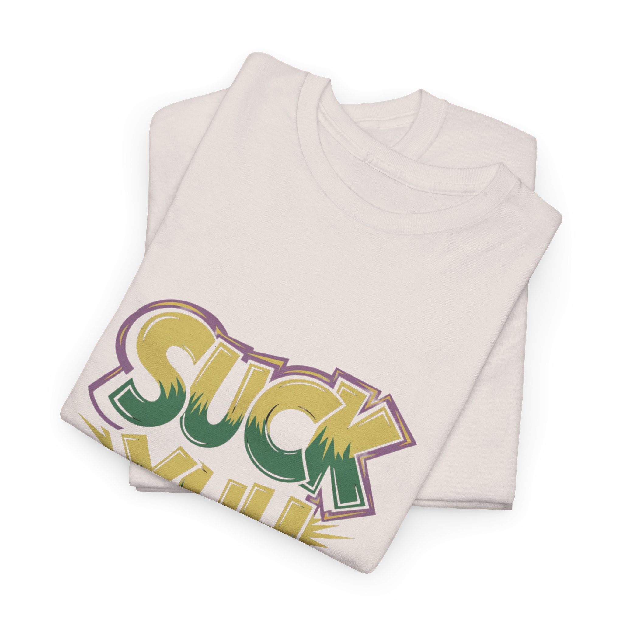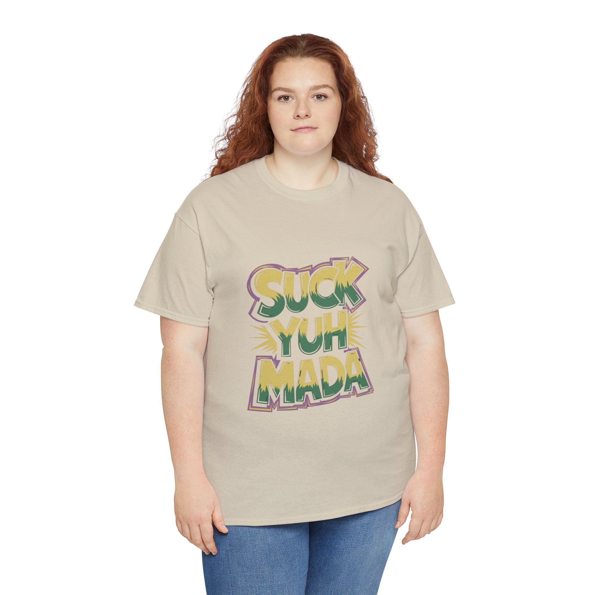 Bold and rebellious, the Suck Yuh Mada T-shirt features graffiti-inspired text in yellow, green, and purple, exuding an energetic vibe. Perfect for those who want to make a statement, this tee is ideal for casual wear and street style enthusiasts. Relevant for occasions where bold fashion choices are celebrated.